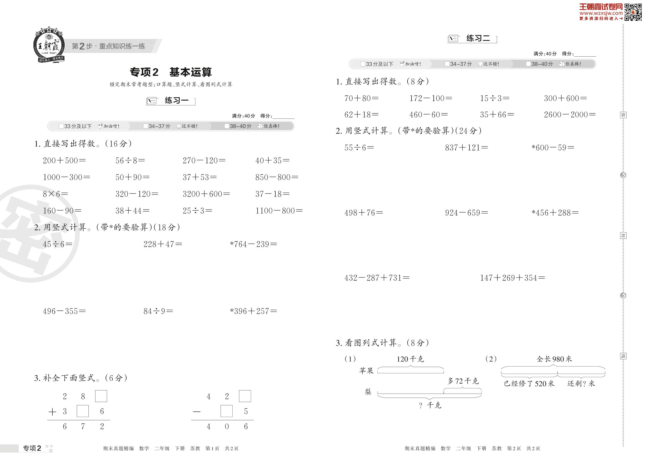 王朝霞期末专项卷——基本运算二年级下册数学(苏教版)_R230420125328292【2】