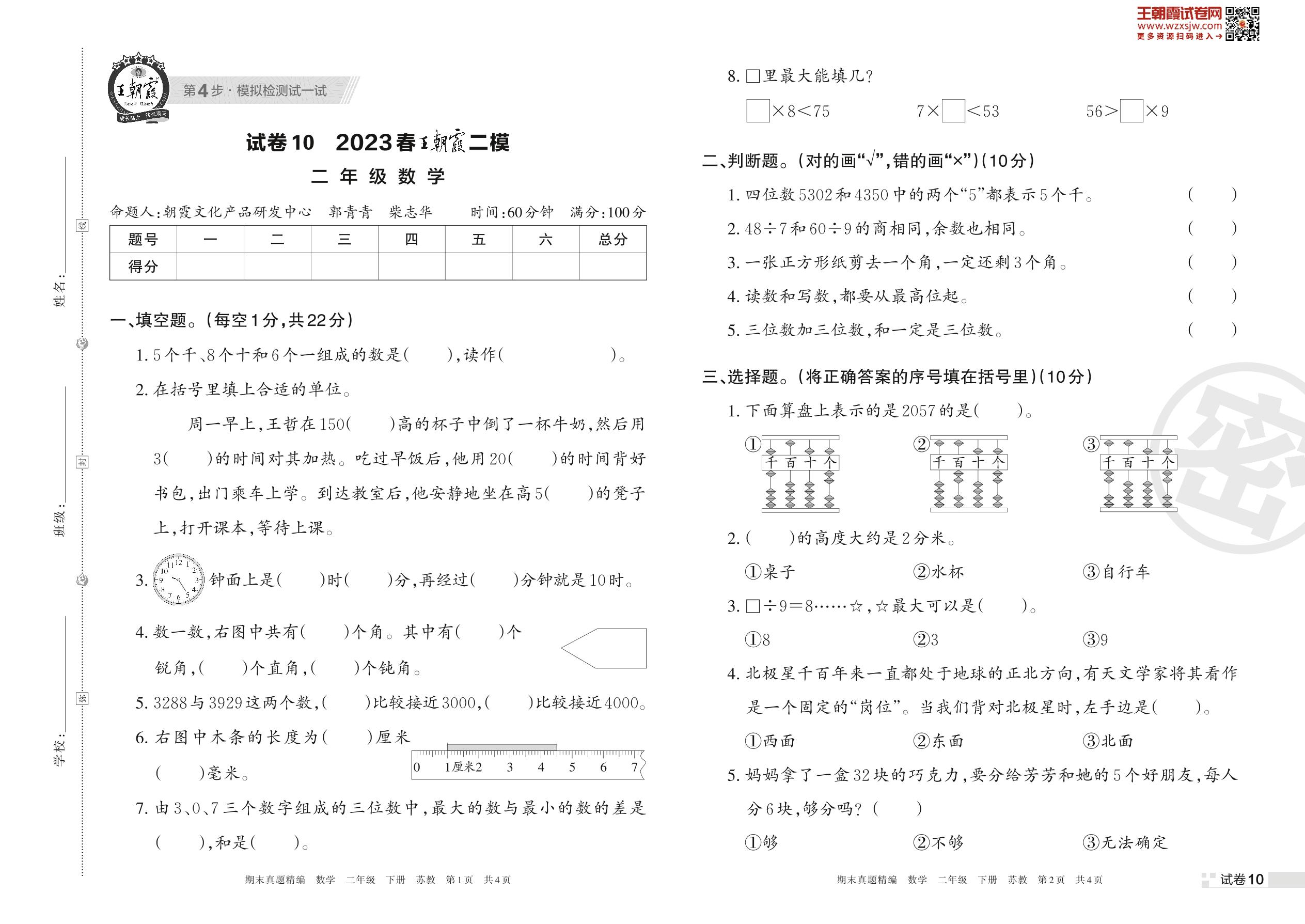 王朝霞期末模拟卷二年级下册数学(苏教版)_R230420125330256【10】