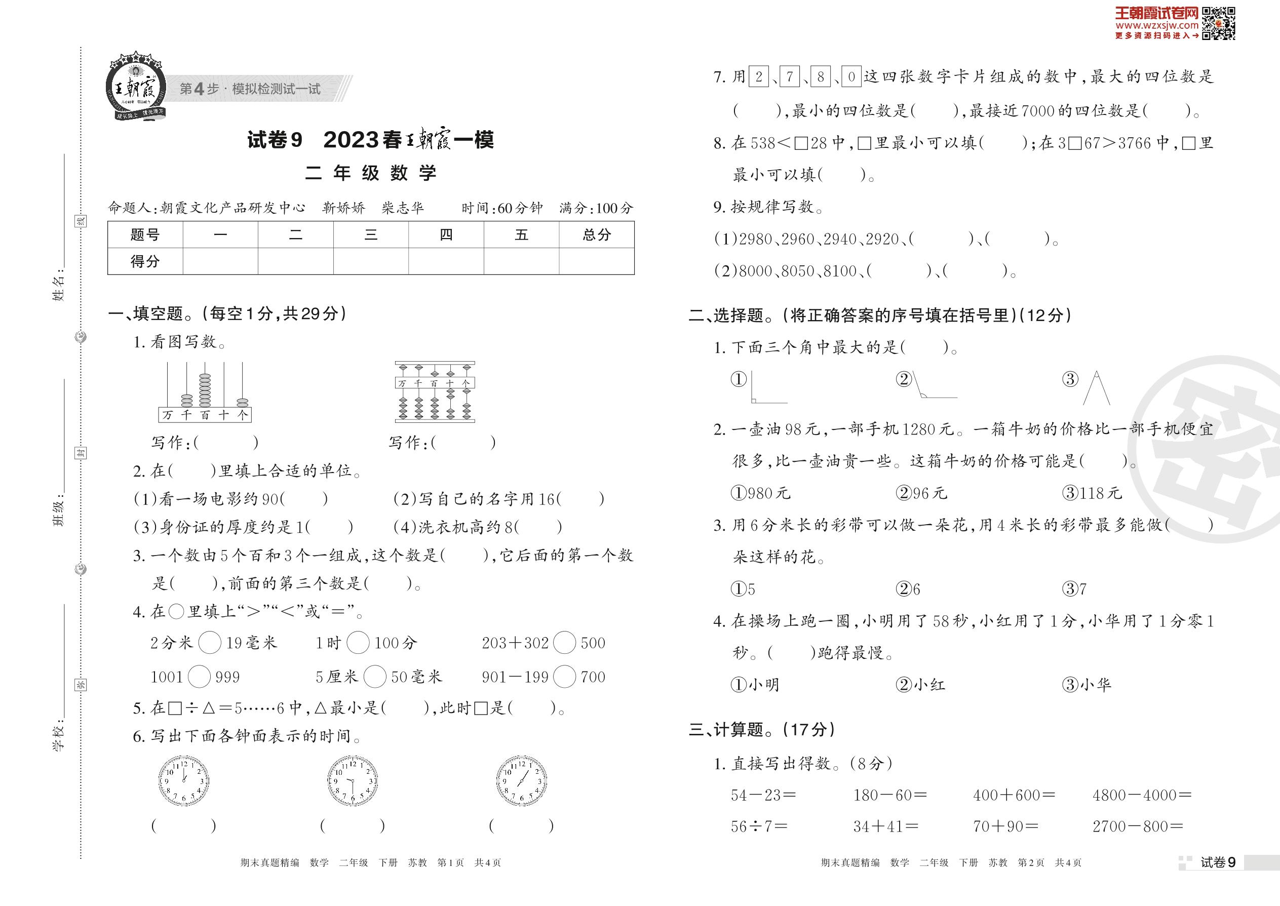 王朝霞期末模拟卷二年级下册数学(苏教版)_R230420125330528【9】