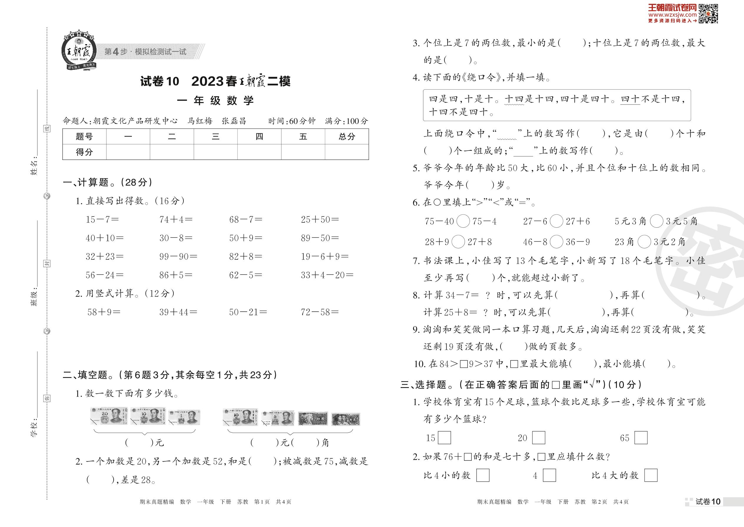 王朝霞期末模拟卷一年级下册数学(苏教版)_R230420130024165【10】