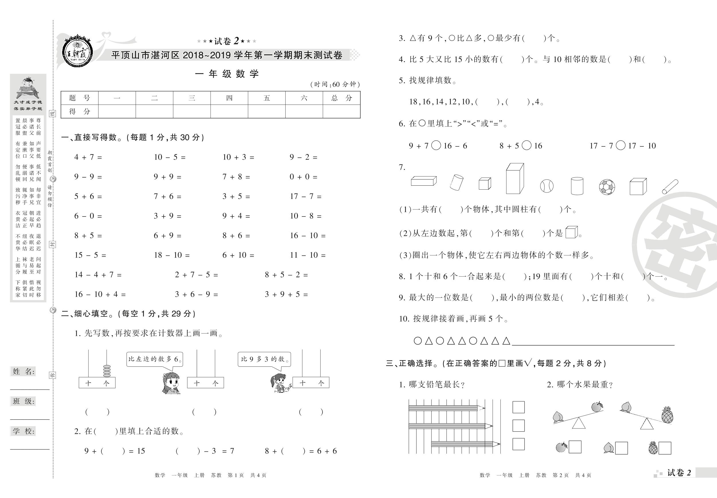 2018-2019学年第一学期平顶山市湛河区一年级数学试卷(苏教版)【2】