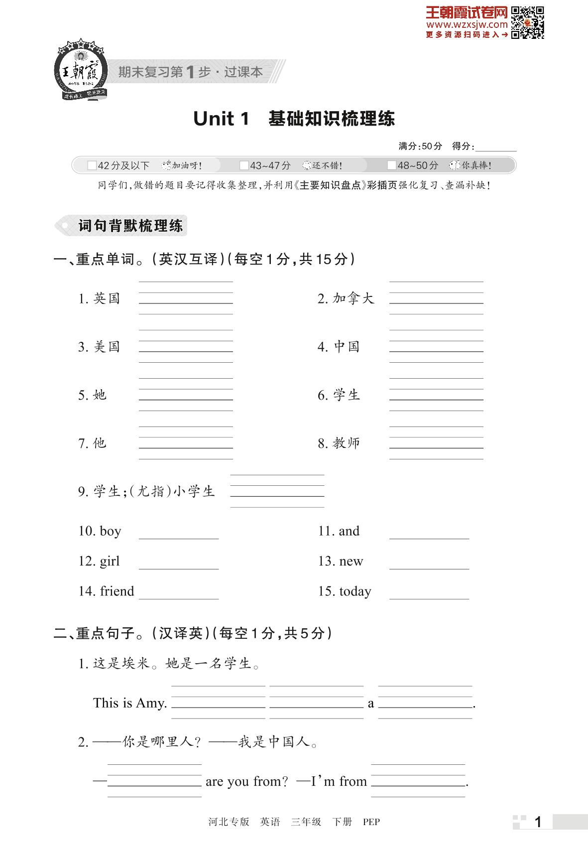 王朝霞期末过课本——Unit 1 基础知识梳理练三年级下册英语(PEP版)_R230420134306574
