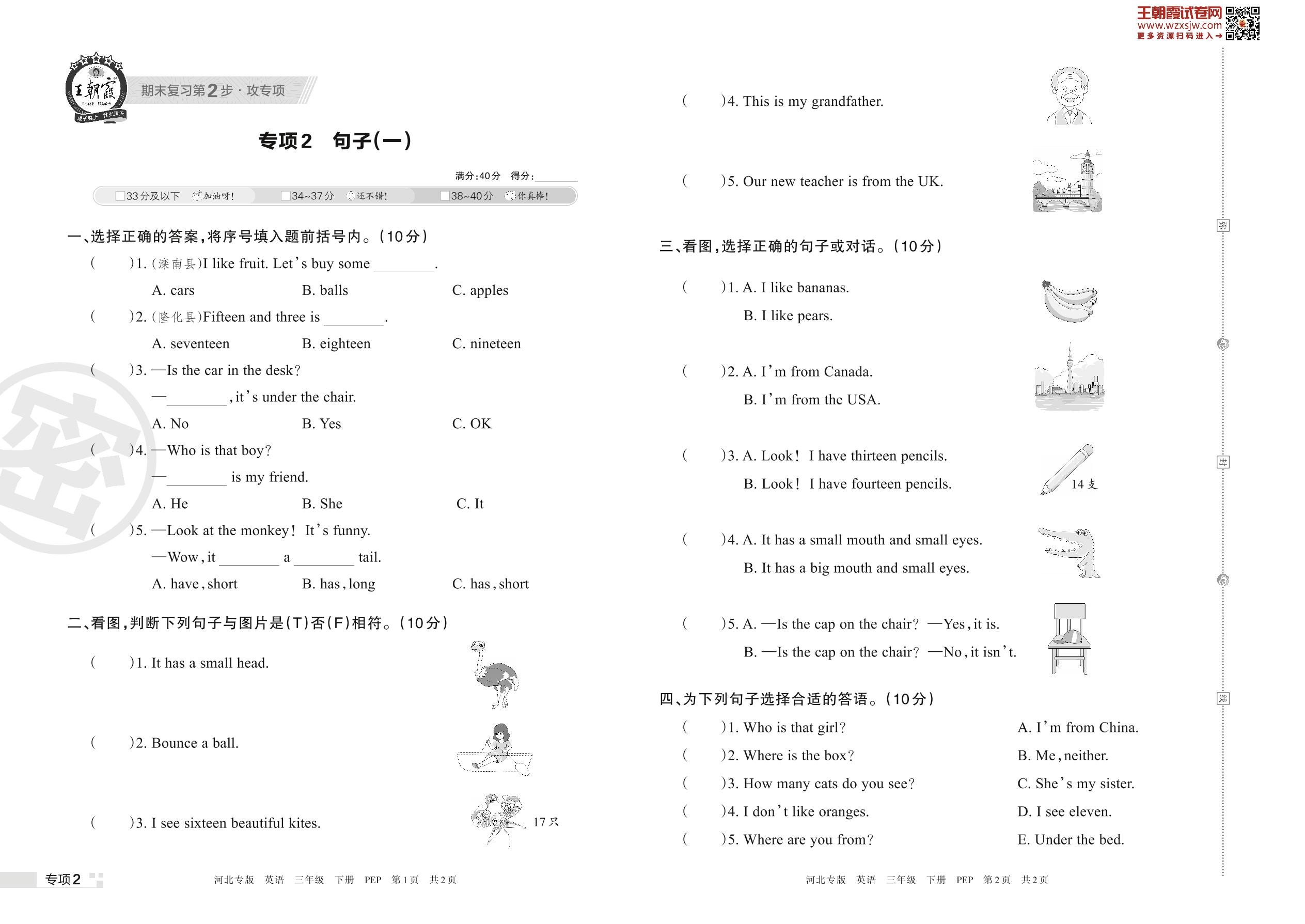 王朝霞期末专项卷——句子(一)三年级下册英语(PEP版)_R230420134307359【2】