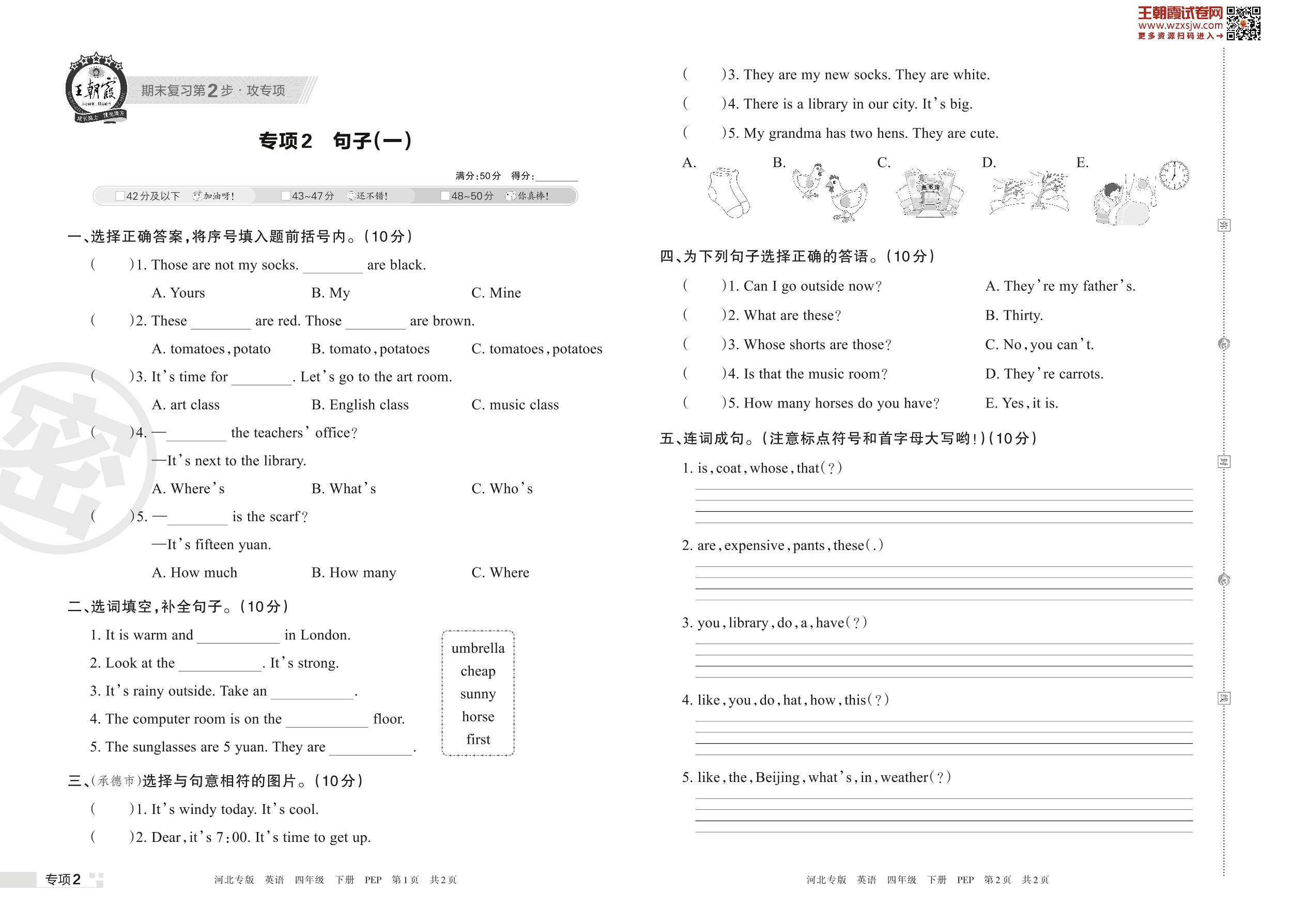 王朝霞期末专项卷——句子(一)四年级下册英语(PEP版)_R230420135010256【2】