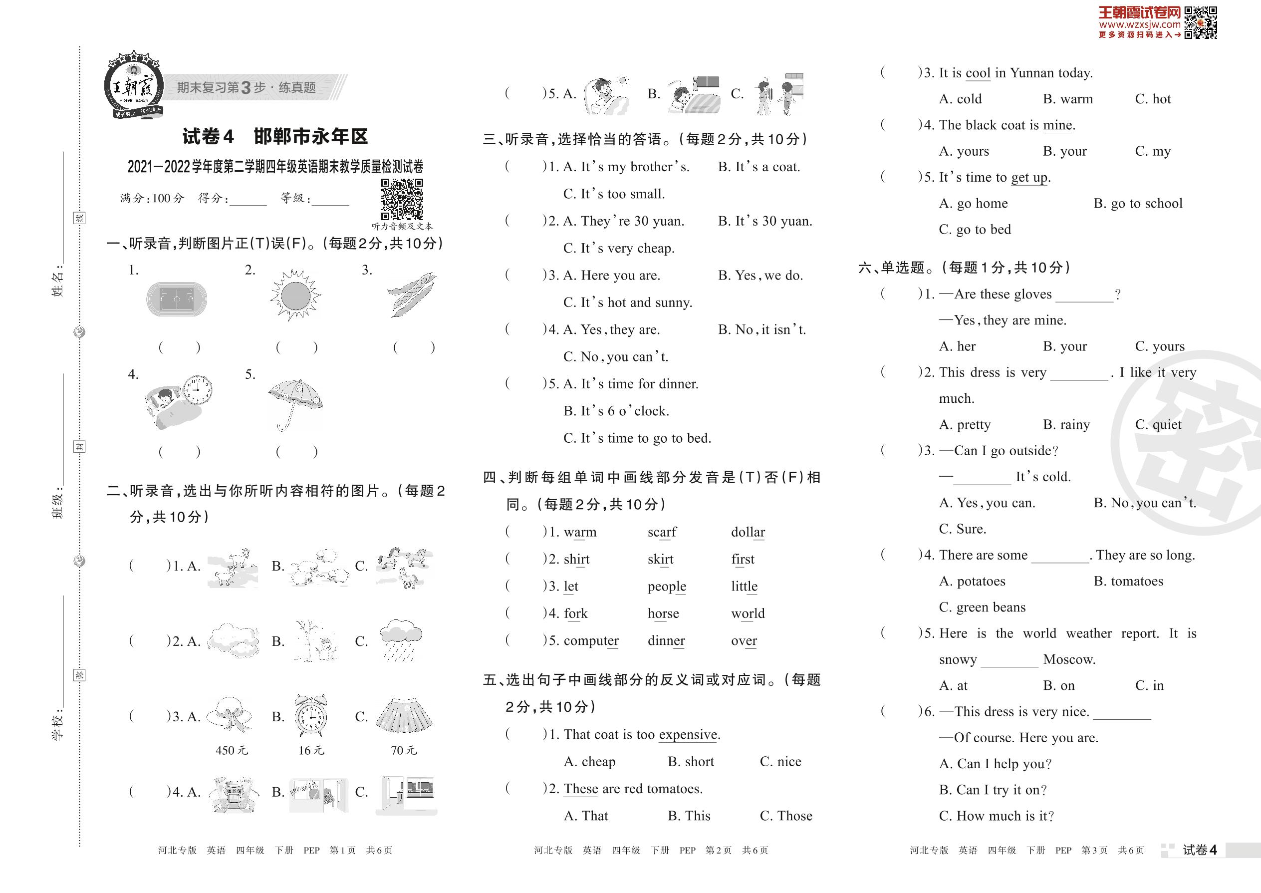 邯郸市永年区2021—2022学年度第二学期四年级英语期末教学质量检测试卷(PEP版)【4】
