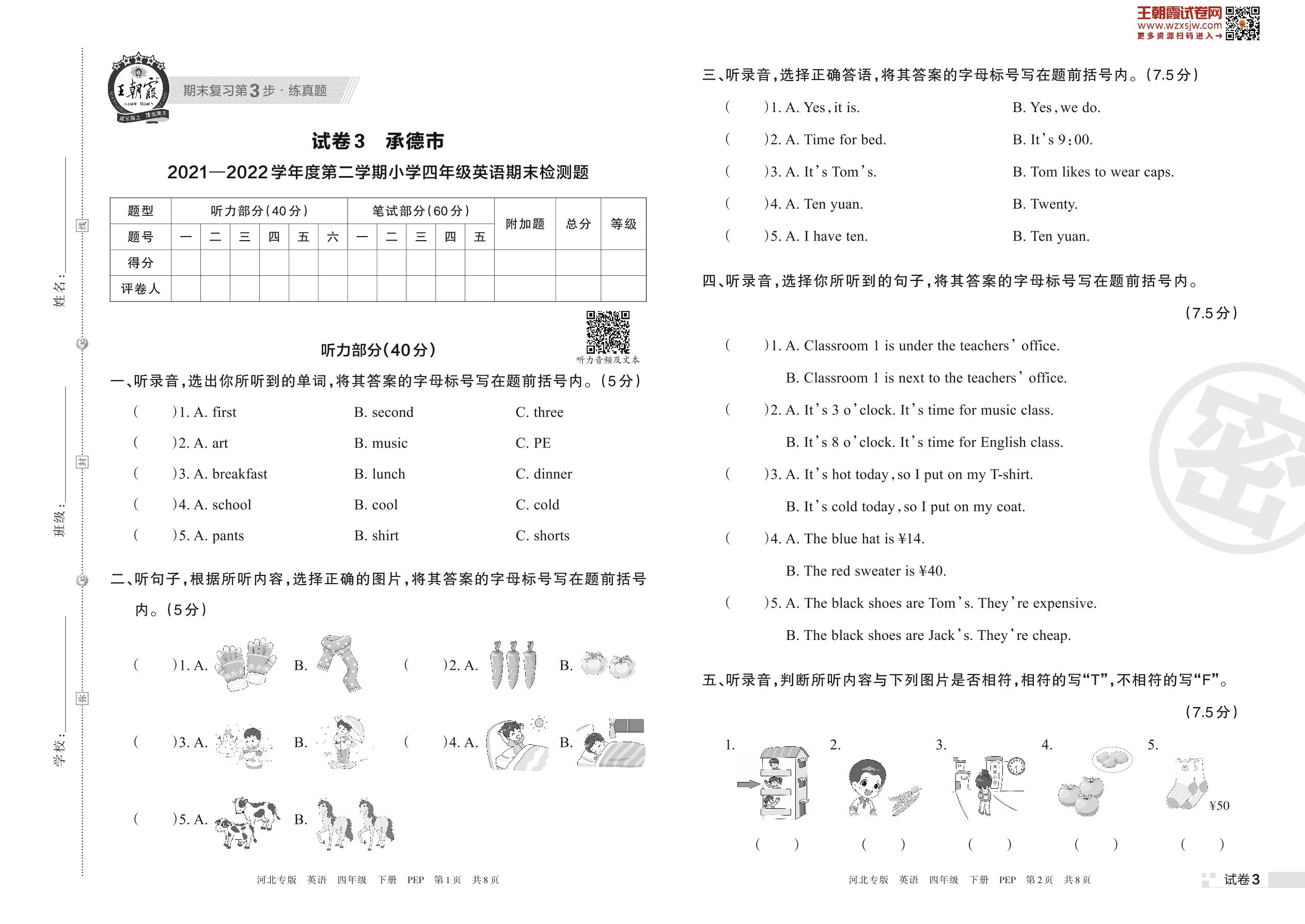 承德市2021—2022学年度第二学期小学四年级英语期末检测题(PEP版)【3】