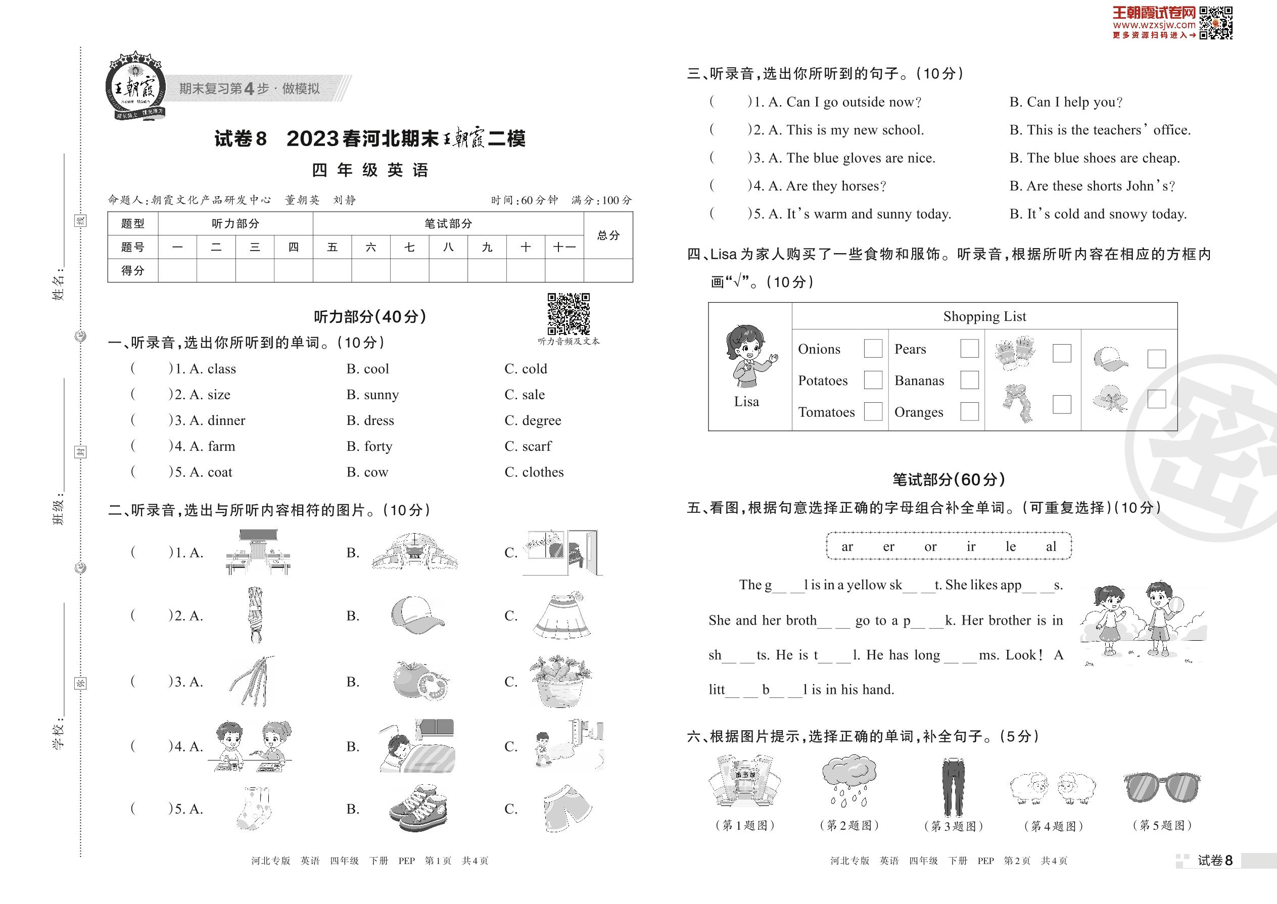 王朝霞期末模拟卷四年级下册英语(PEP版)_R230420135011544【8】