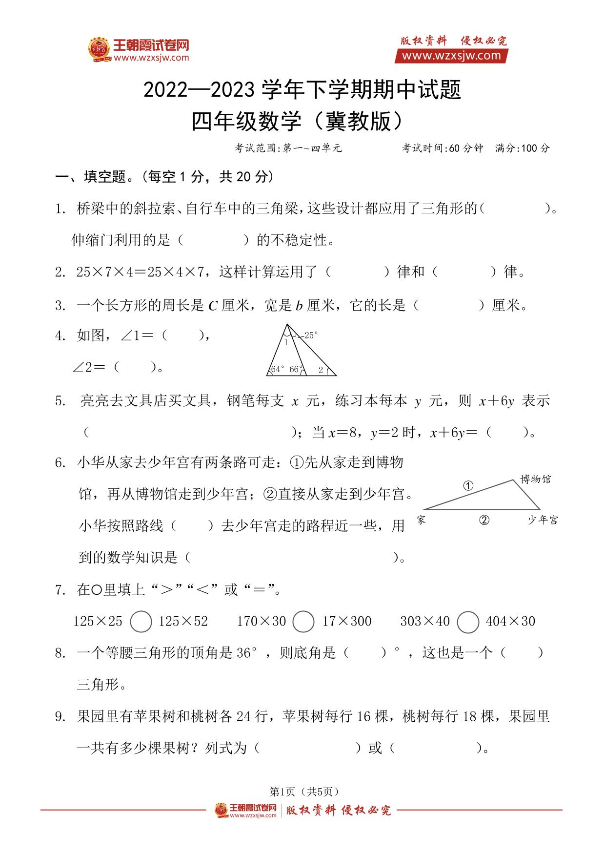 2022—2023学年下学期期中试题四年级数学(冀教版)