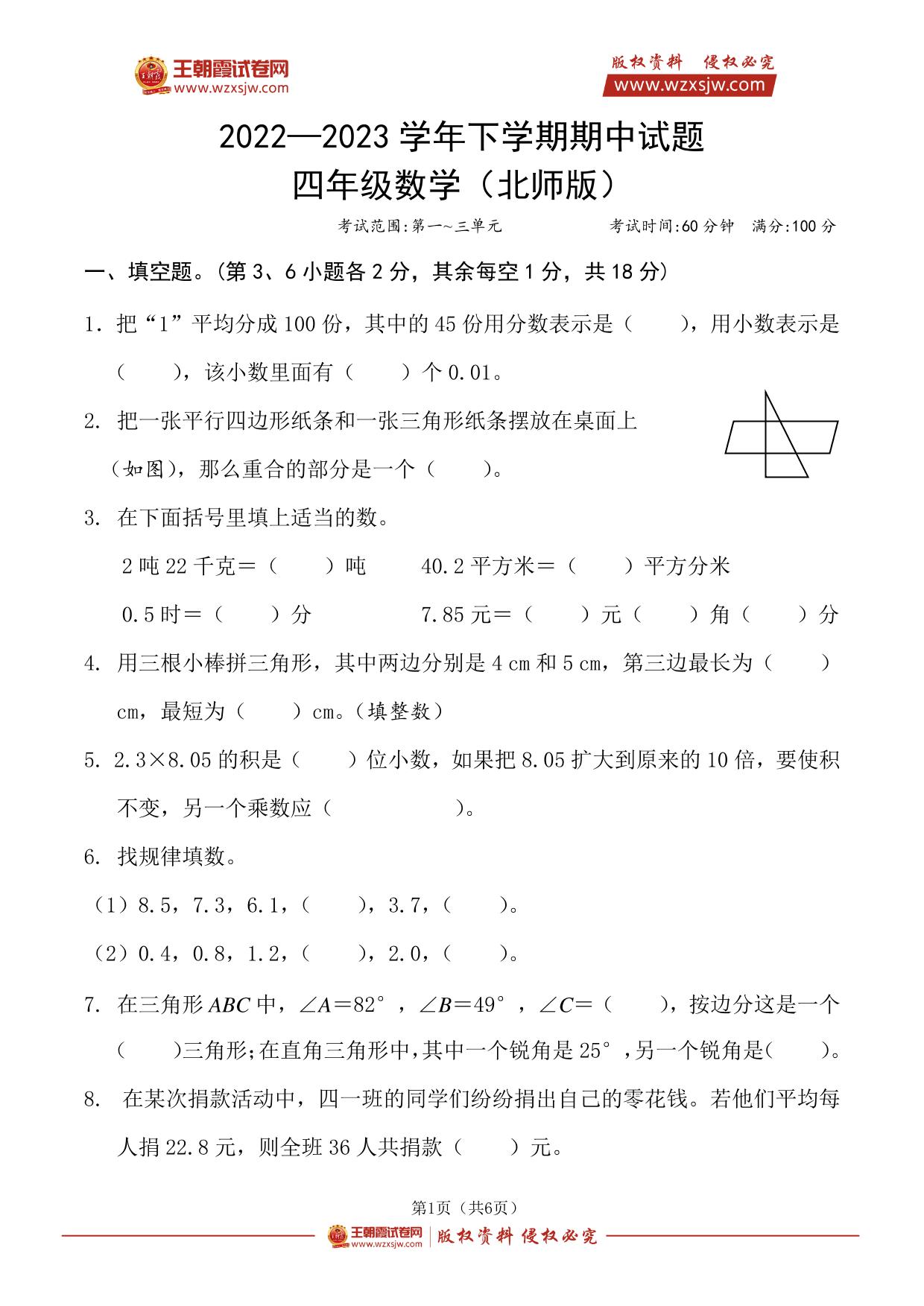 2022—2023学年下学期期中试题四年级数学(北师版)_R230420142708675