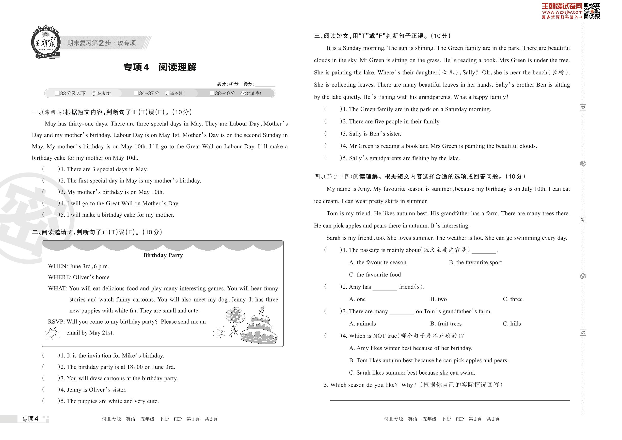 王朝霞期末专项卷——阅读理解五年级下册英语(PEP版)_R230420144746402【4】