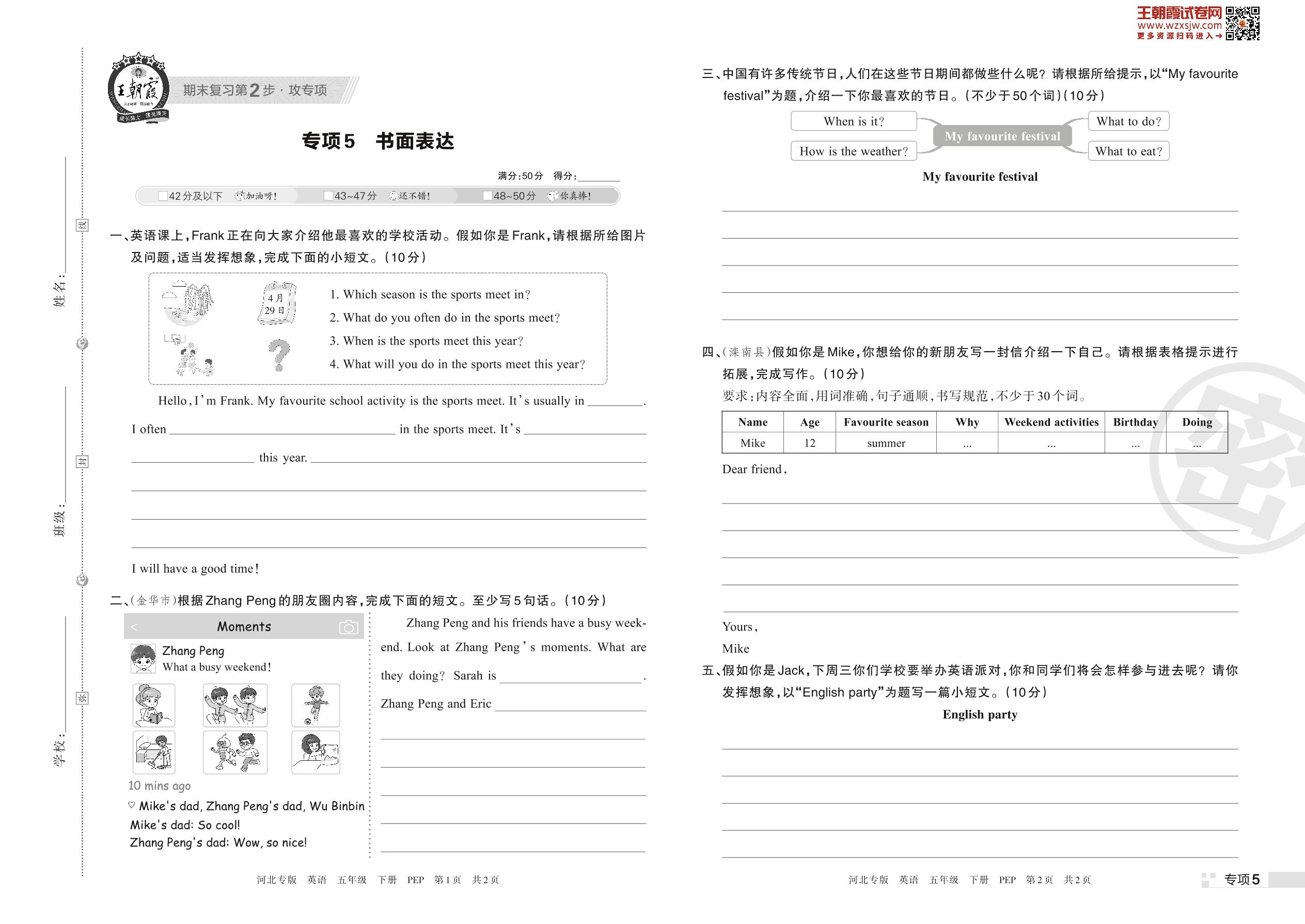 王朝霞期末专项卷——书面表达五年级下册英语(PEP版)_R230420144746885【5】