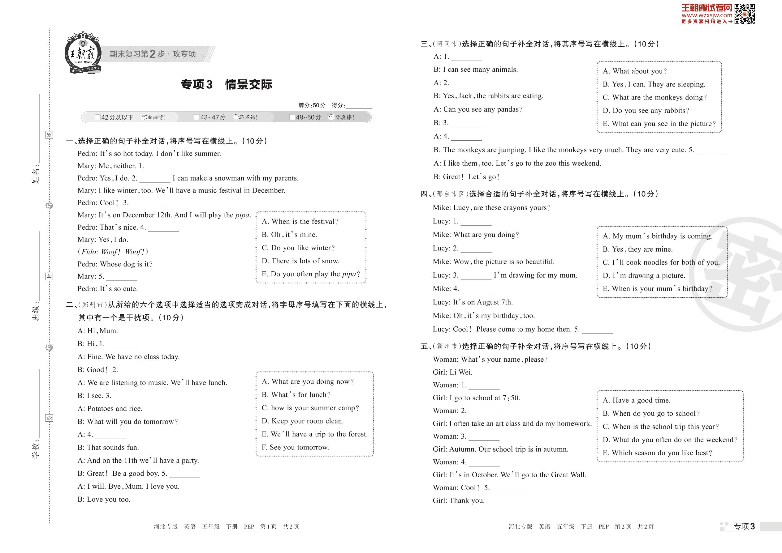 王朝霞期末专项卷——情景交际五年级下册英语(PEP版)_R230420144746423【3】