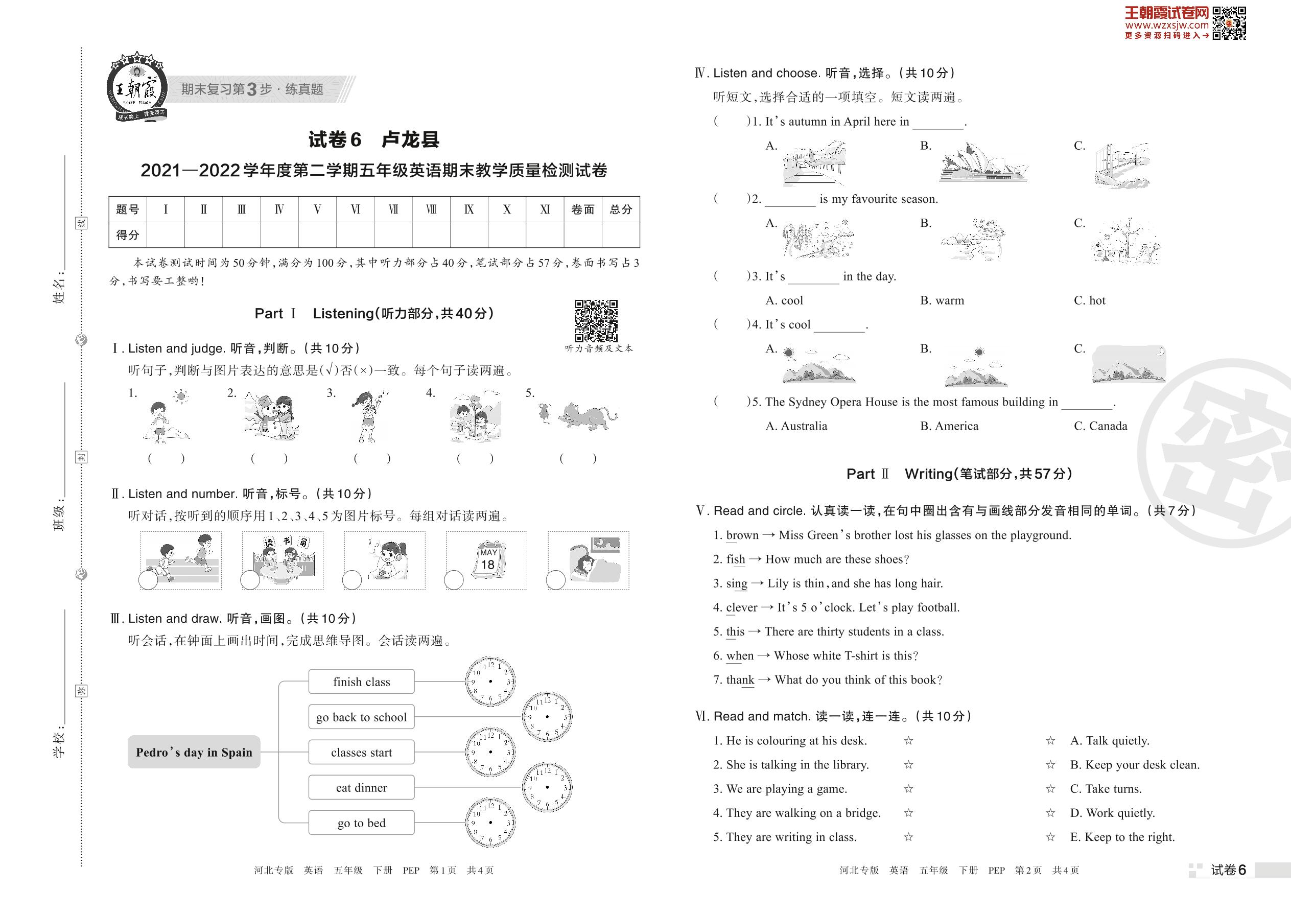 卢龙县2021—2022学年度第二学期五年级英语期末教学质量检测试卷(PEP版)【6】