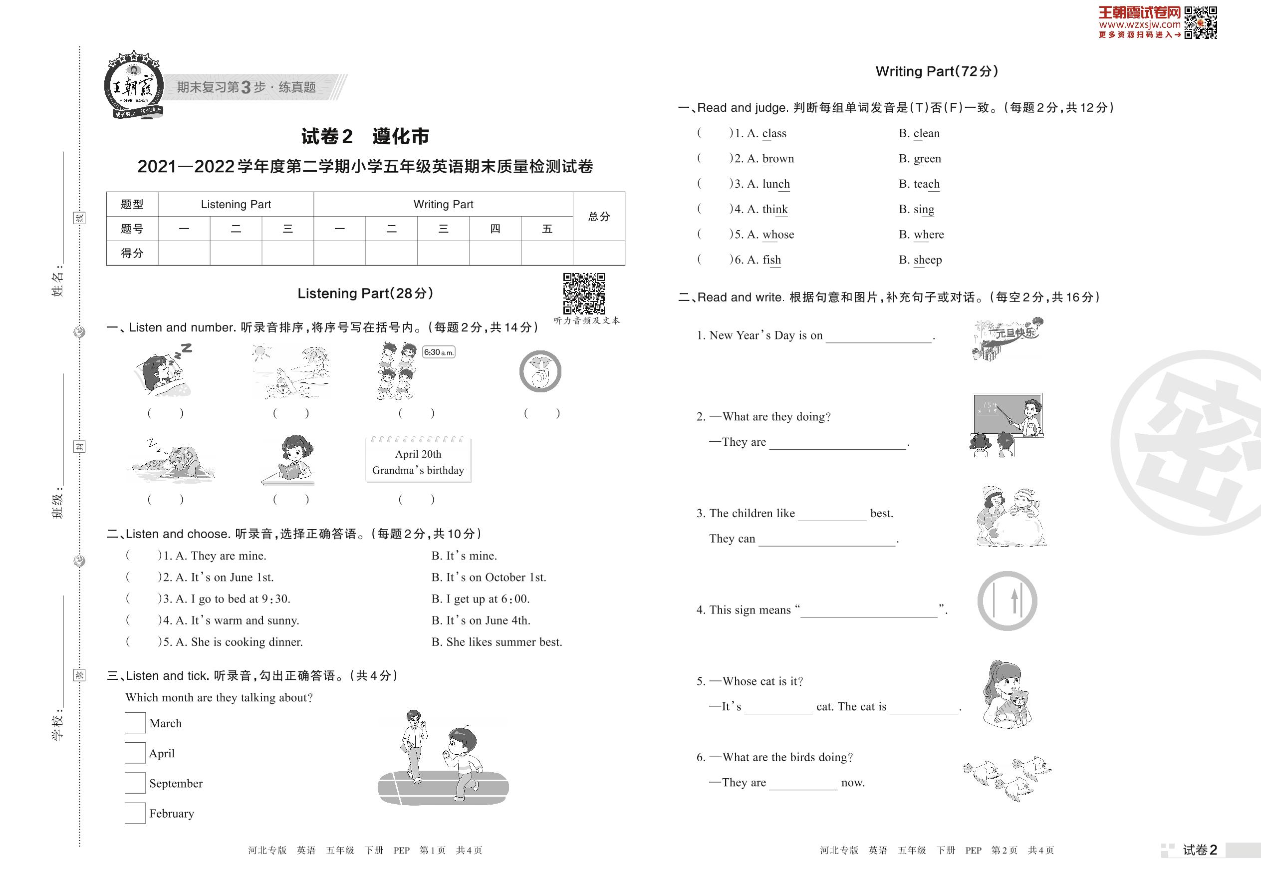 遵化市2021—2022学年度第二学期小学五年级英语期末质量检测试卷(PEP版)【2】