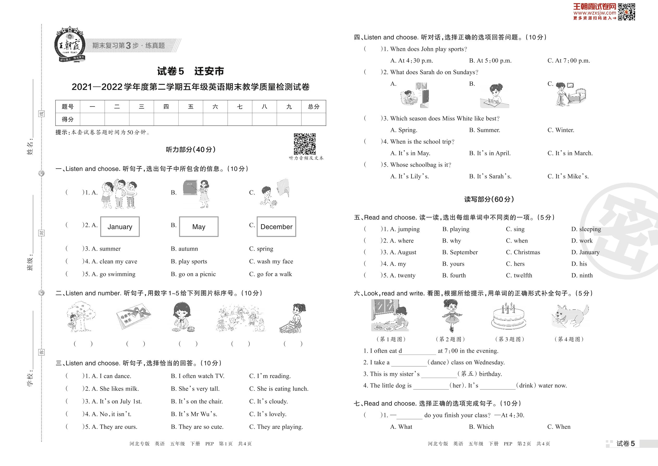 迁安市2021—2022学年第二学期五年级英语期末教学质量检测试卷(PEP版)【5】