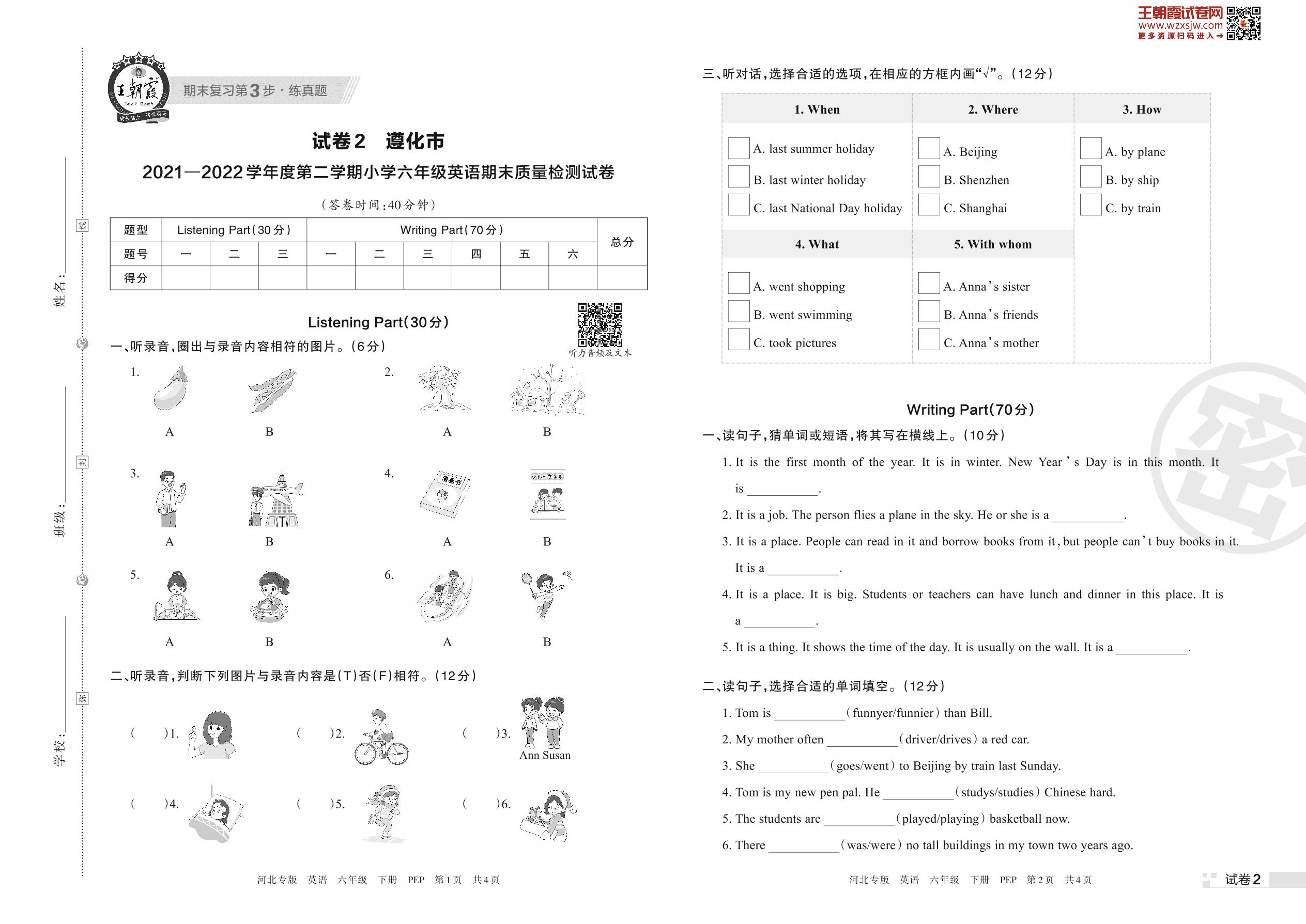 遵化市2021—2022学年度第二学期小学六年级英语期末质量检测试卷(PEP版)_R230420145319027【2】