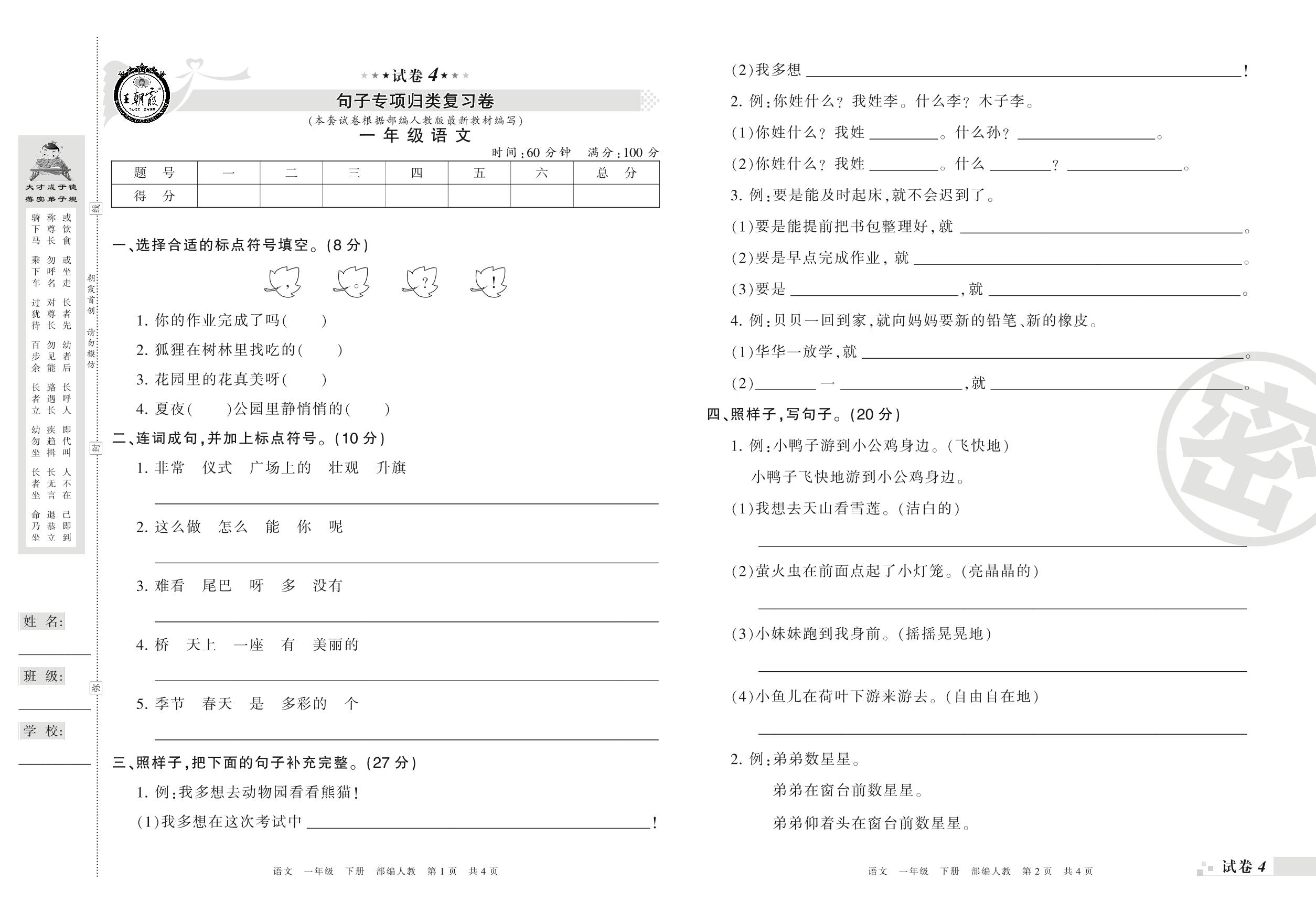 王朝霞期末专项卷——句子专项归类复习卷一年级下册语文(人教版)_R210731190518【4】