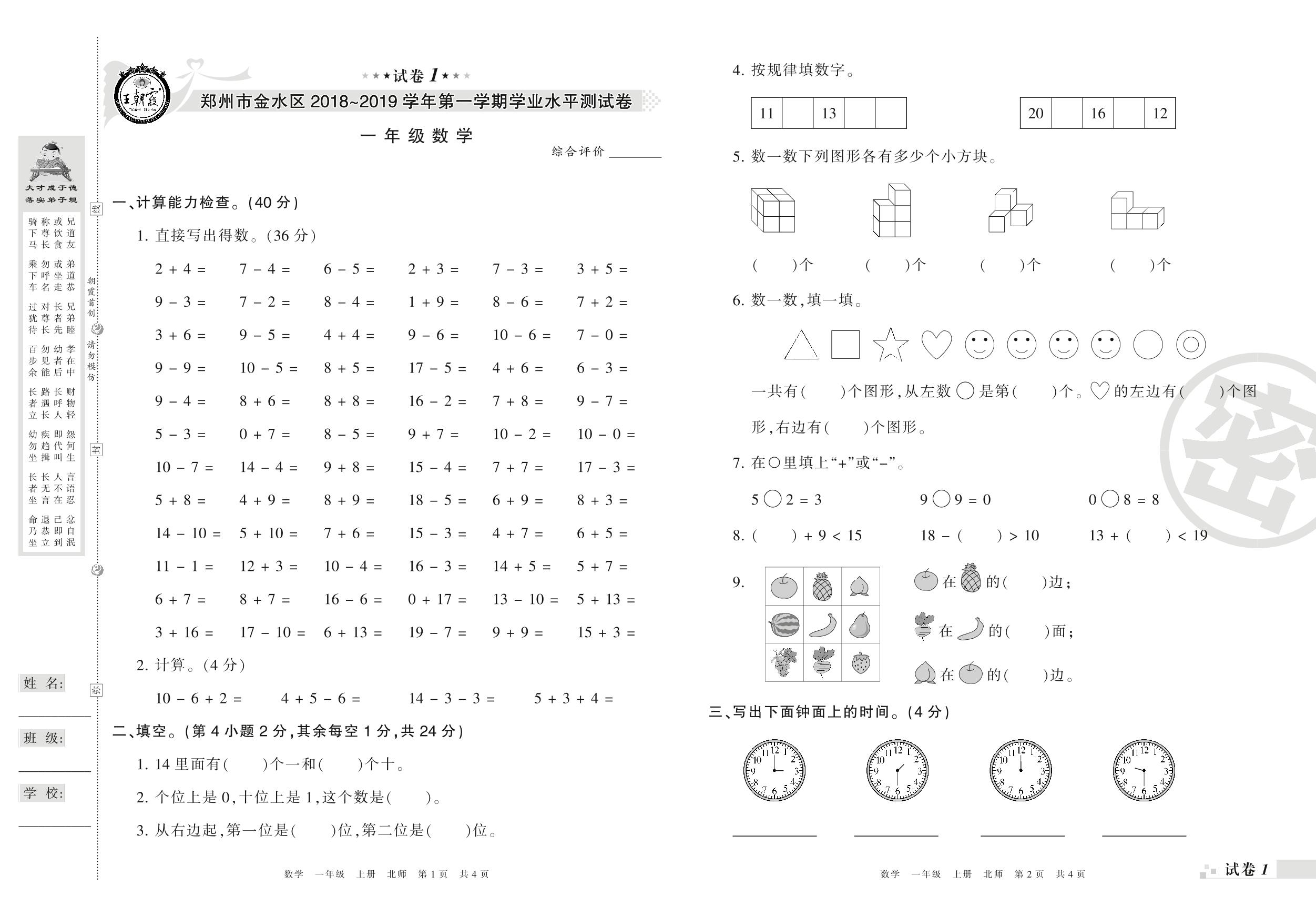 2018-2019学年第一学期郑州市金水区一年级数学试卷(北师版)_R210802214550【1】