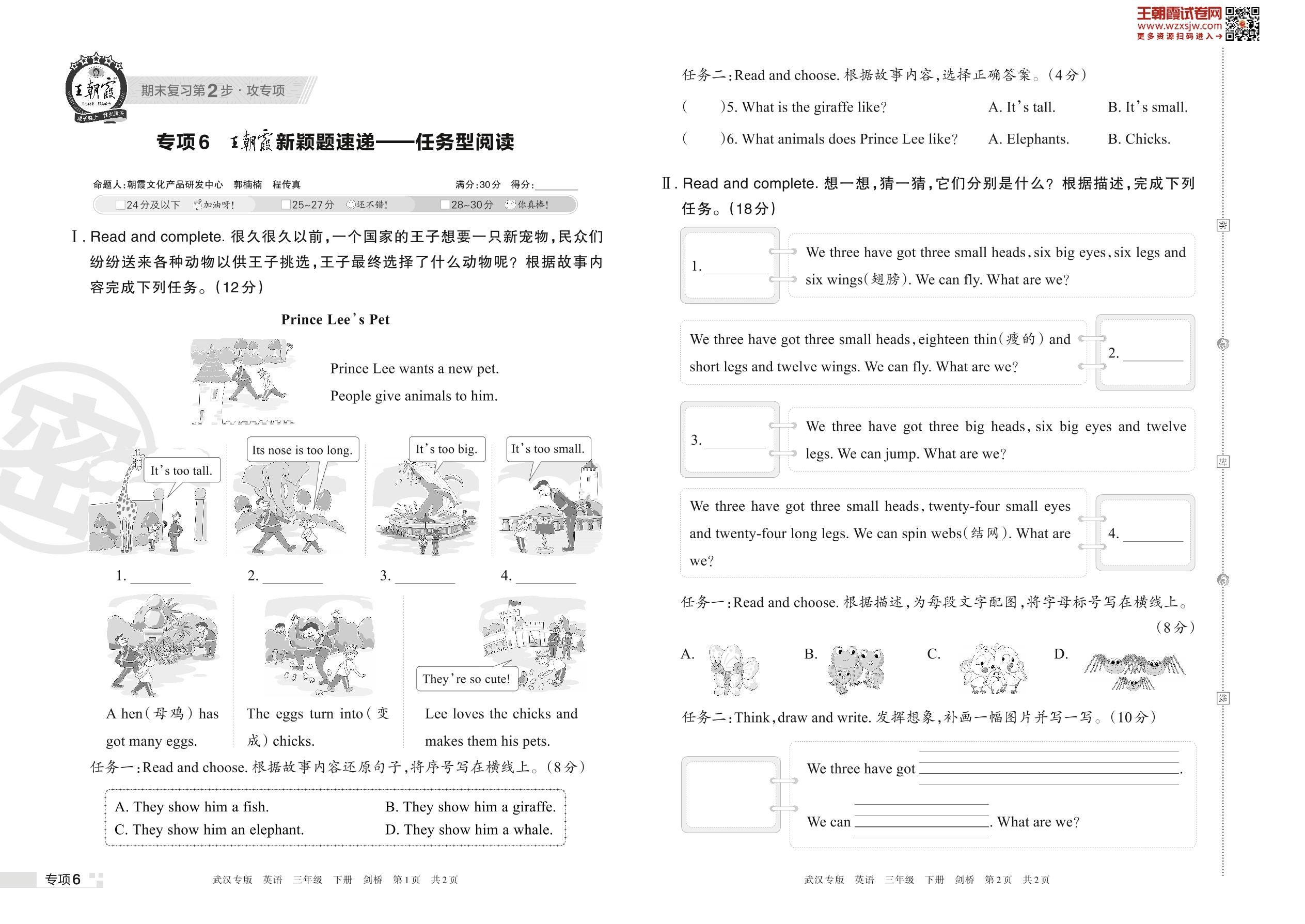 王朝霞期末专项卷——王朝霞新颖题速递:任务型阅读三年级下册英语(剑桥版)【6】