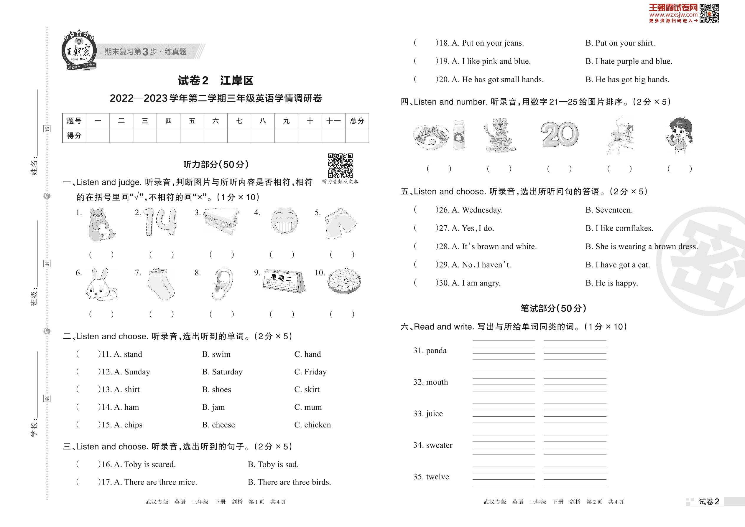 江岸区2022—2023学年第二学期三年级英语学情调研卷(剑桥版)【2】