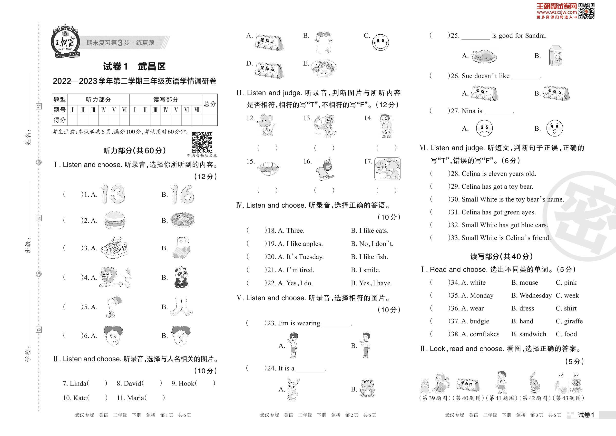 武昌区2022—2023学年第二学期三年级英语学情调研卷(剑桥版)【1】