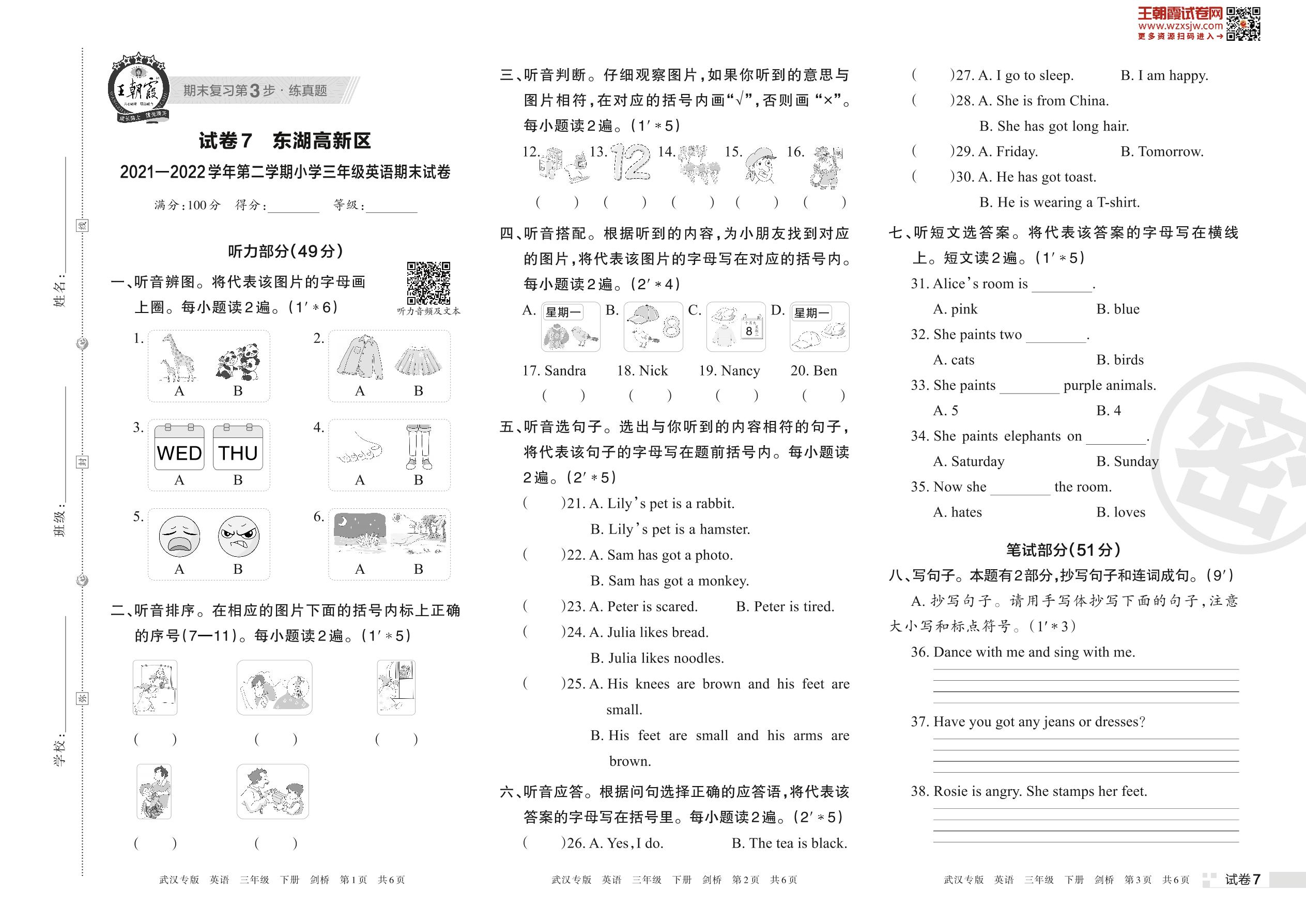 东湖高新区2021—2022学年第二学期小学三年级英语期末试卷(剑桥版)【7】
