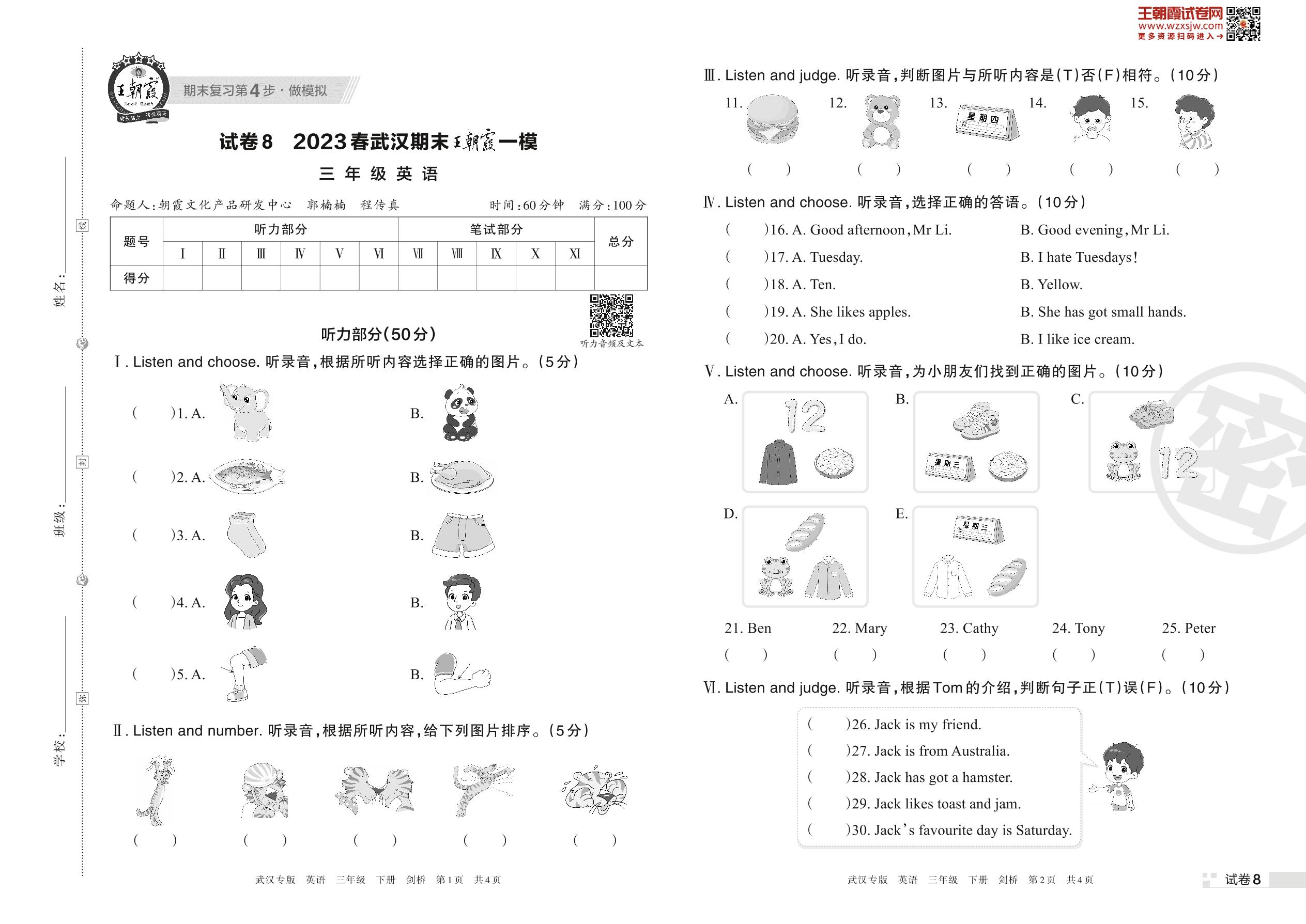 王朝霞期末模拟卷三年级下册英语(剑桥版)【8】