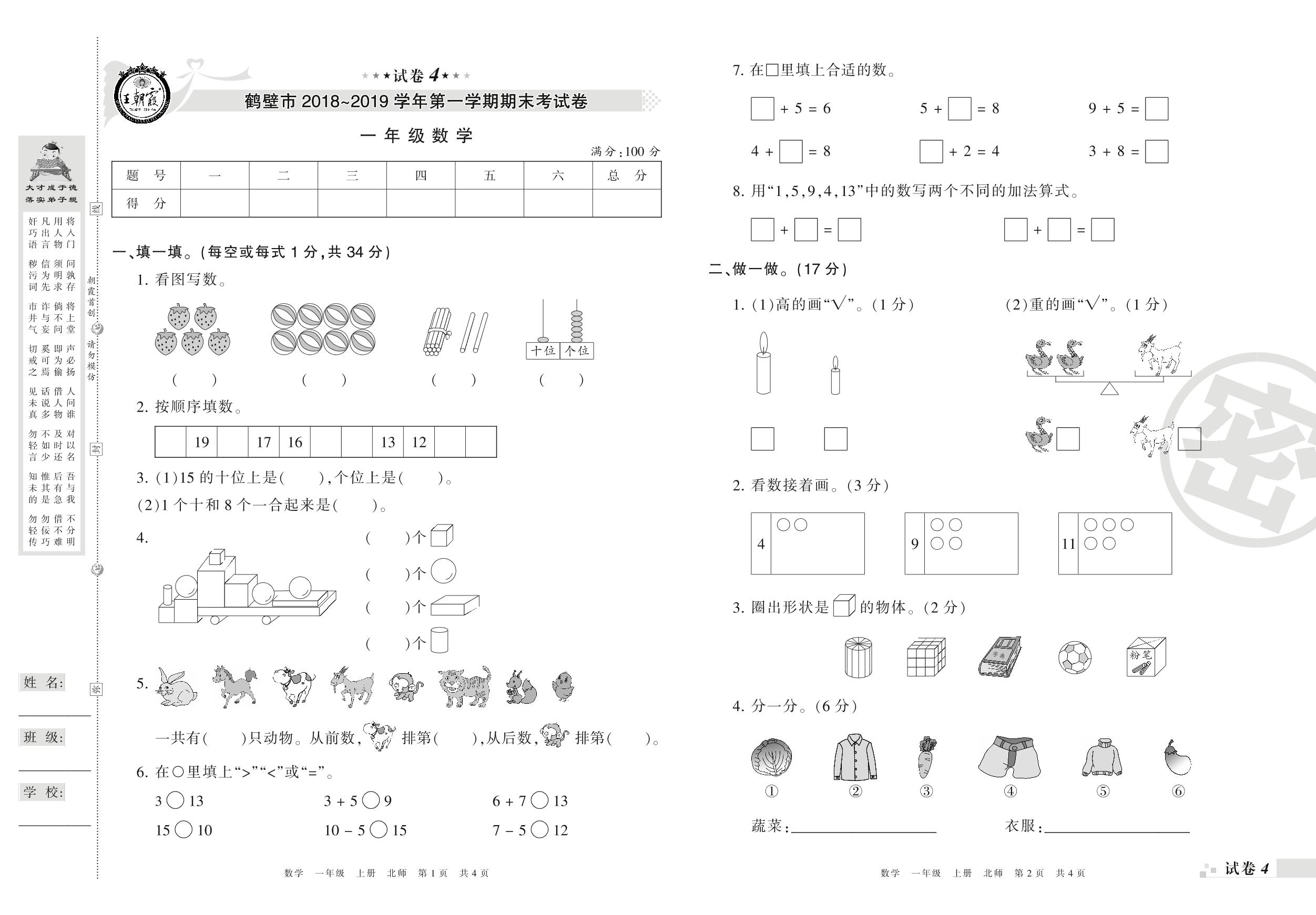 2018-2019学年第一学期鹤壁市一年级数学试卷(北师版)【4】