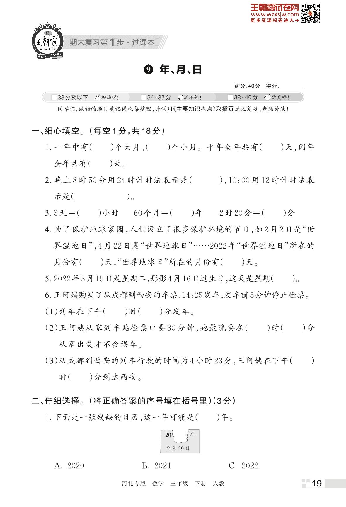 王朝霞期末过课本——9 年、月、日三年级下册数学(人教版)