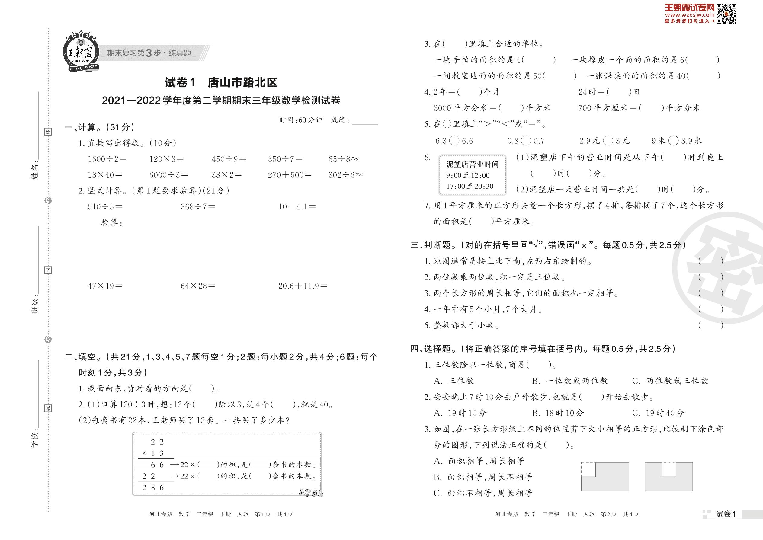 唐山市路北区2021—2022学年度第二学期期末三年级数学检测试卷(人教版)【1】