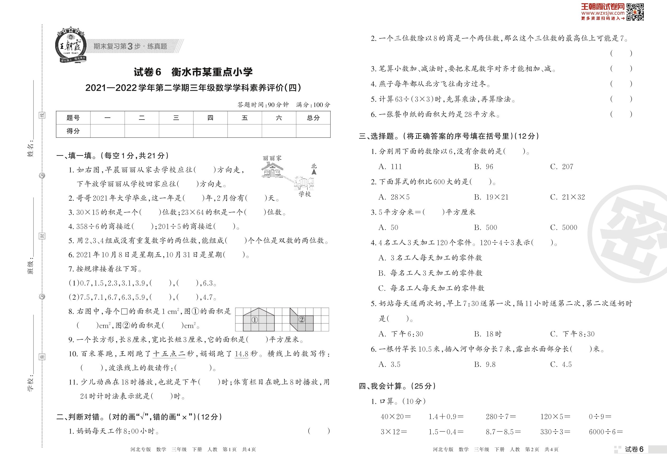 衡水市某重点小学2021—2022学年第二学期三年级数学学科素养评价(四)(人教版)【6】