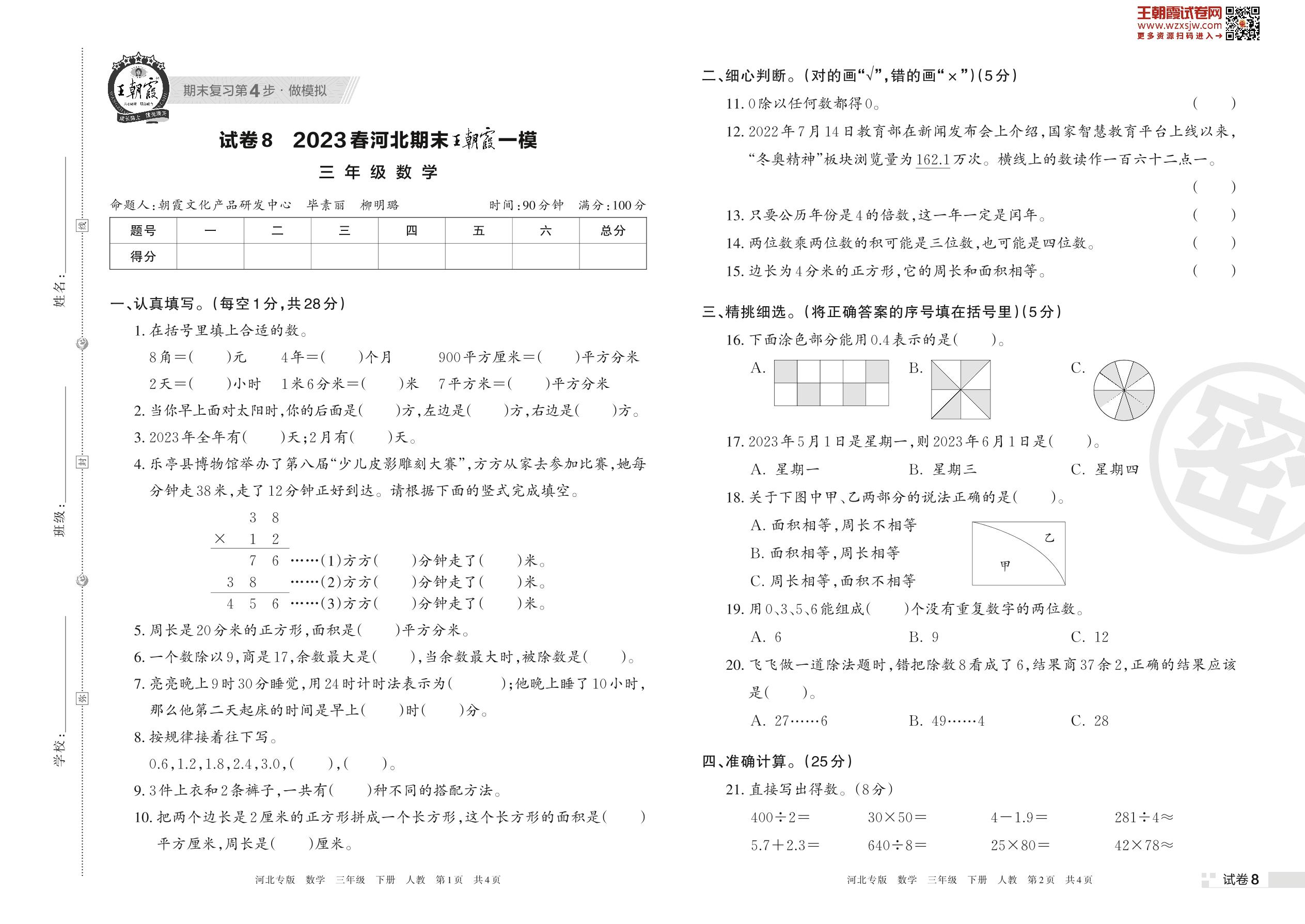 王朝霞期末模拟卷三年级下册数学(人教版)_R230420145947143【8】