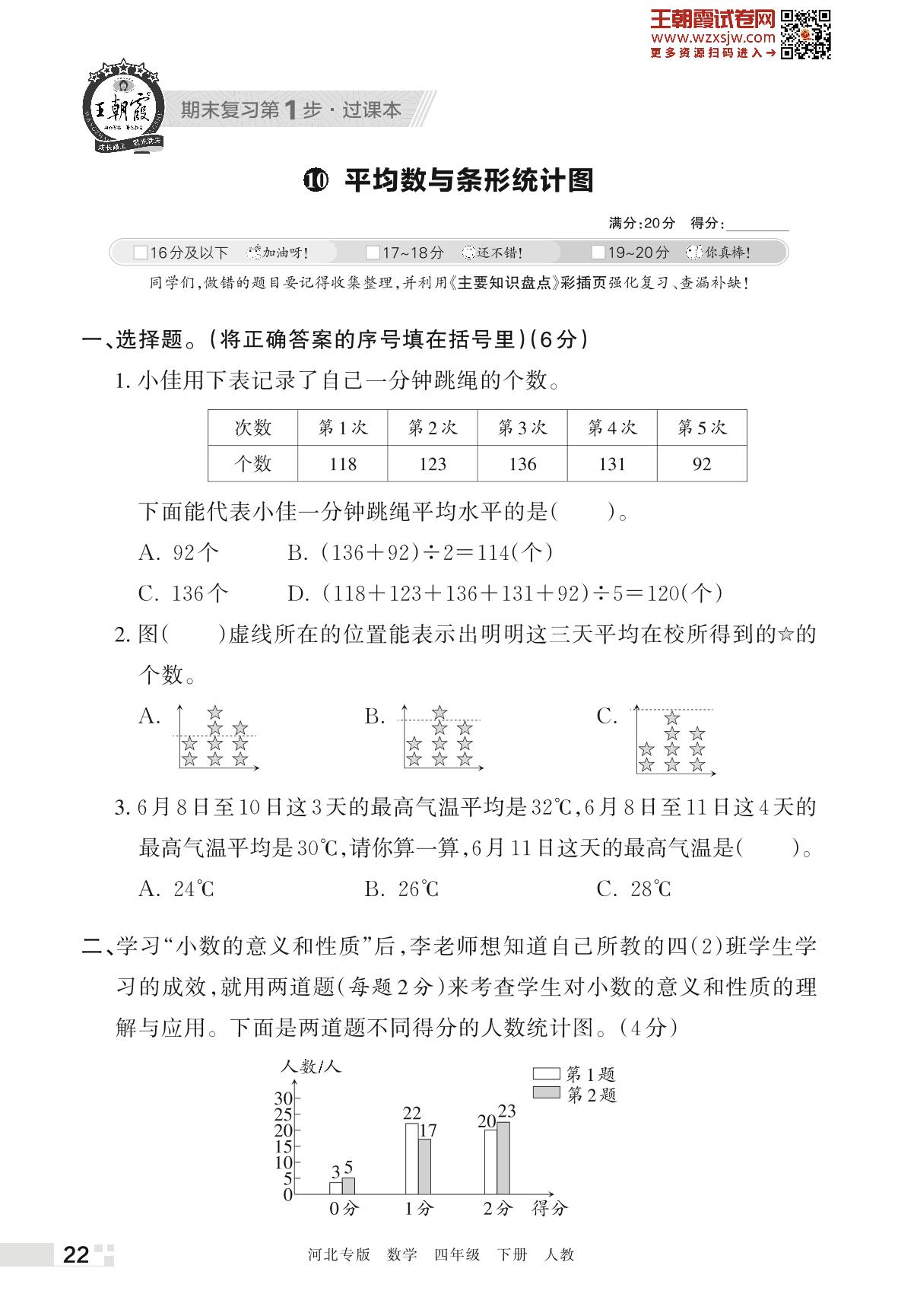 王朝霞期末过课本——10 平均数与条形统计图四年级下册数学(人教版)