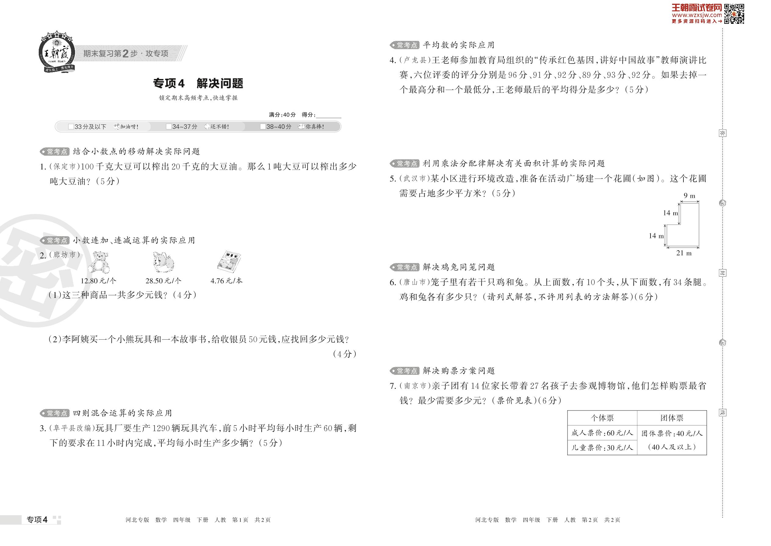 王朝霞期末专项卷——解决问题四年级下册数学(人教版)_R230420150618596【4】