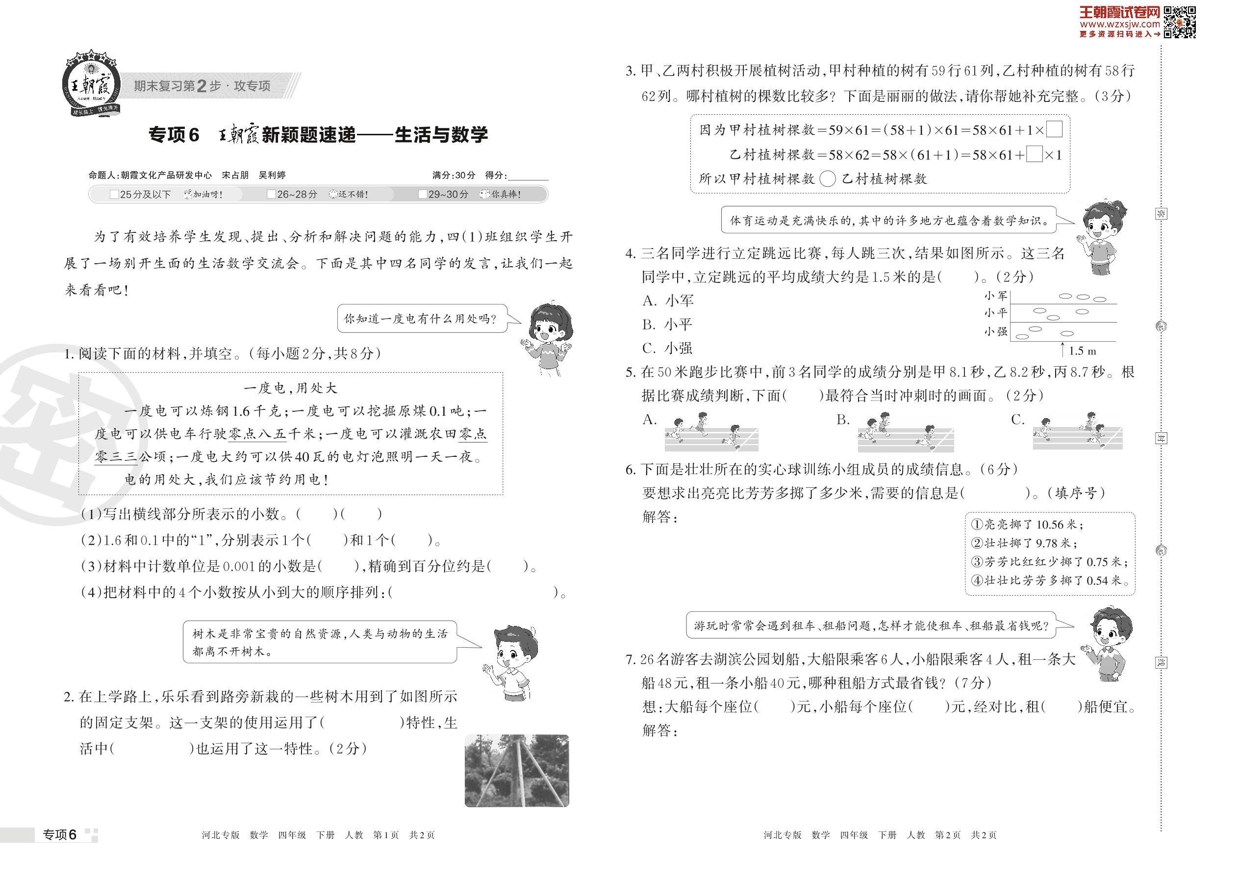 王朝霞期末专项卷——王朝霞新颖题速递:生活与数学四年级下册数学(人教版)【6】