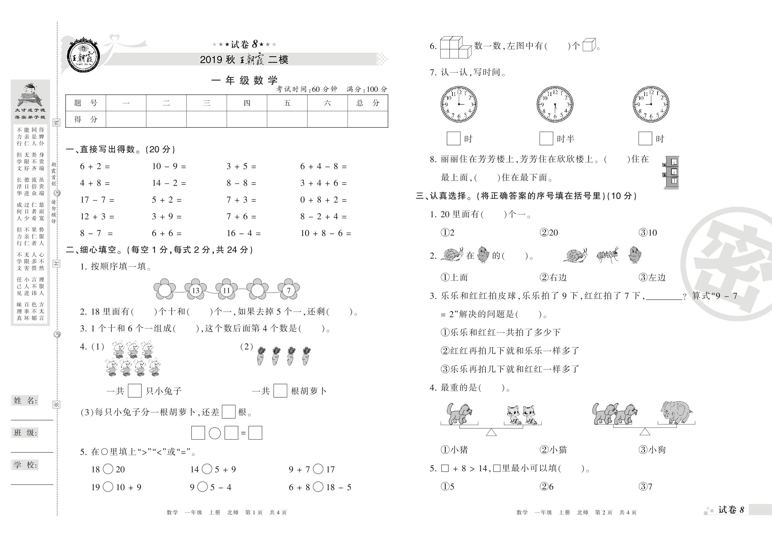 王朝霞期末模拟卷一年级上册数学(北师版)_R210802214623【8】