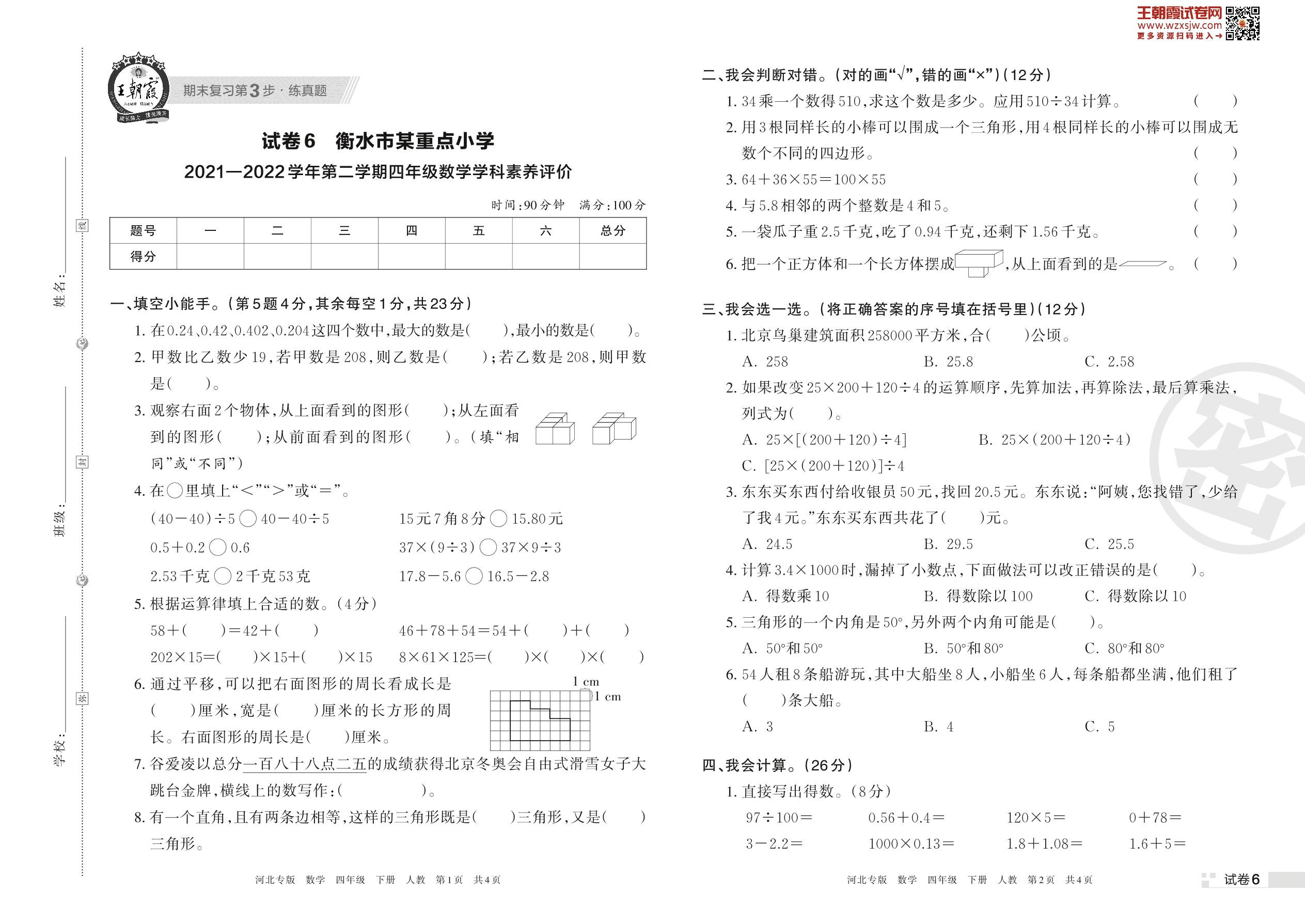 衡水市某重点小学2021—2022学年第二学期四年级数学学科素养评价(人教版)【6】
