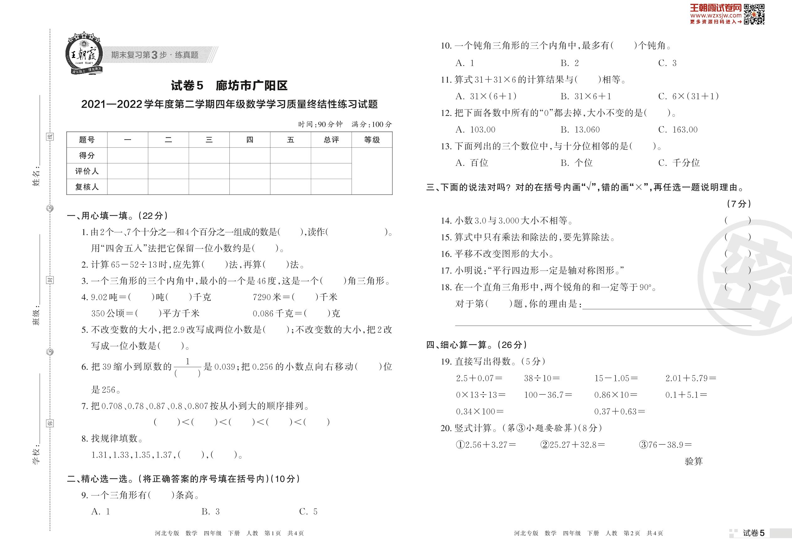 廊坊市广阳区2021—2022学年度第二学期四年级数学学习质量终结性练习试题(人教版)【5】