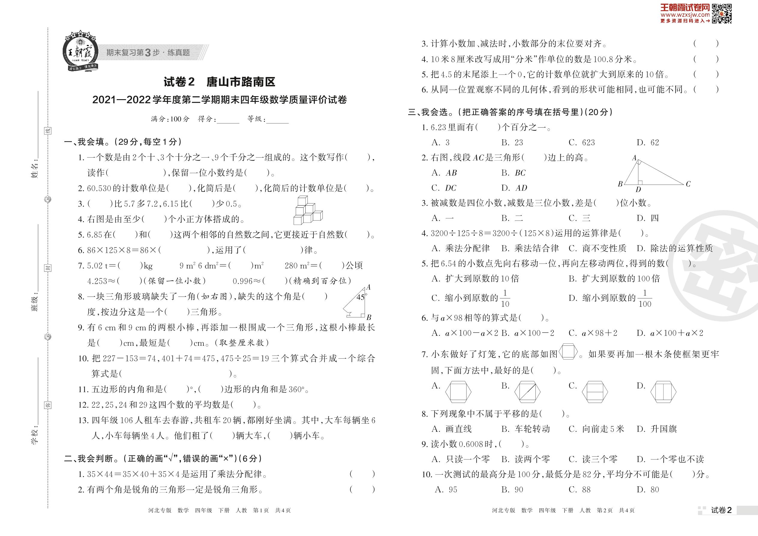 唐山市路南区2021—2022学年度第二学期期末四年级数学质量评价试卷(人教版)【2】