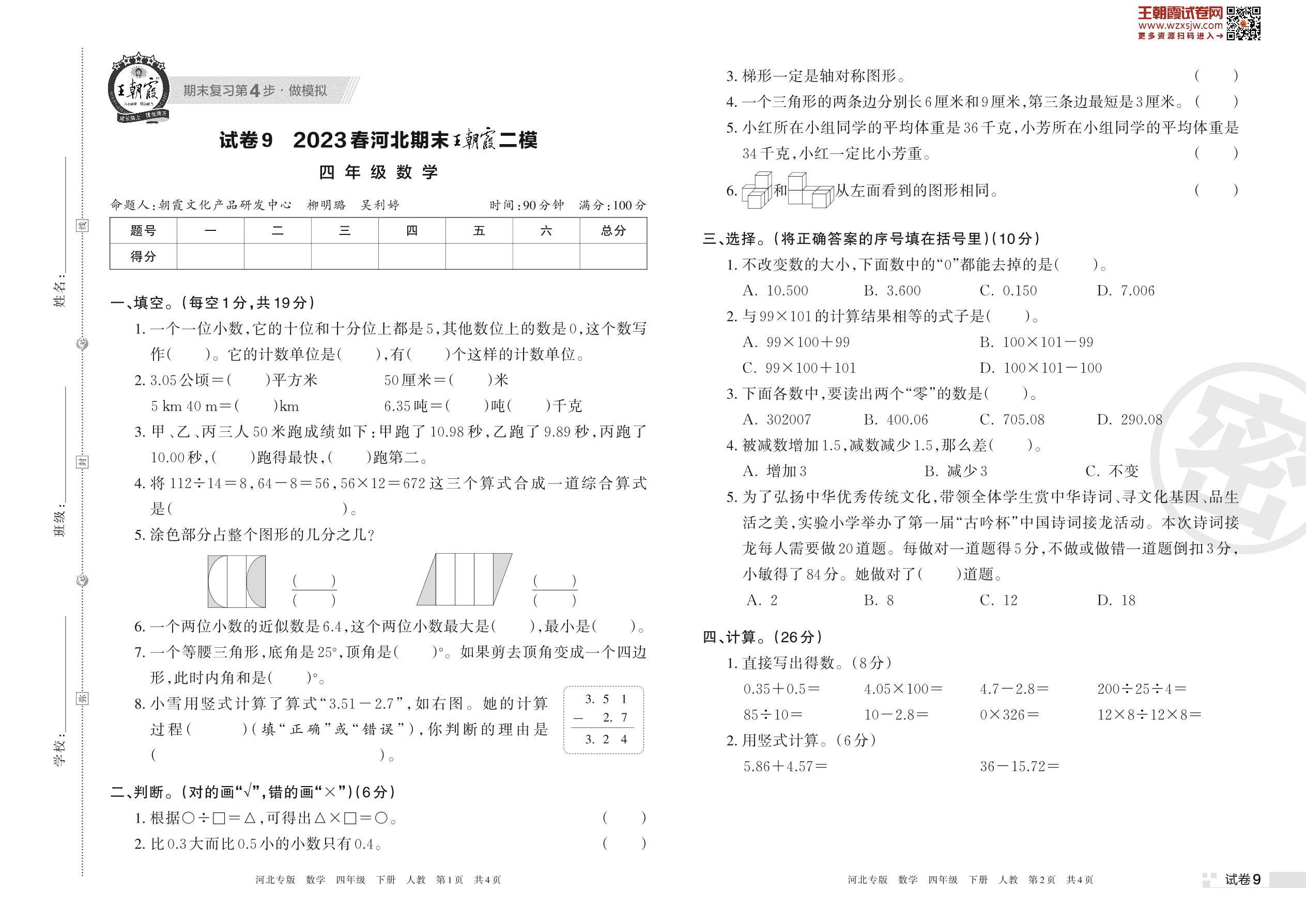 王朝霞期末模拟卷四年级下册数学(人教版)【9】