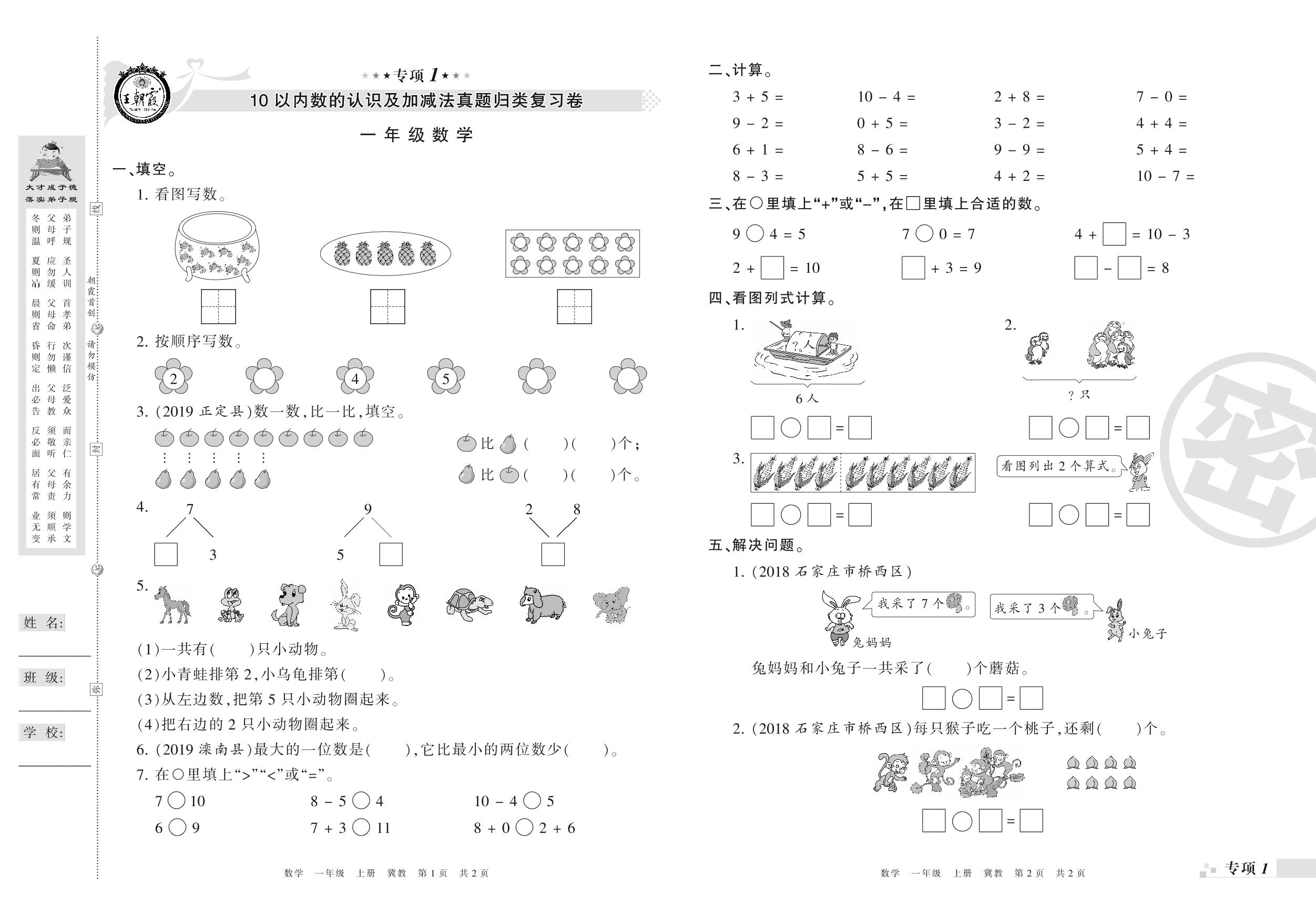 王朝霞期末专项卷——10以内数的认识及加减法、10~20各数的认识真题归类复习一年级上册数学(冀教版)_R210802214635【0】