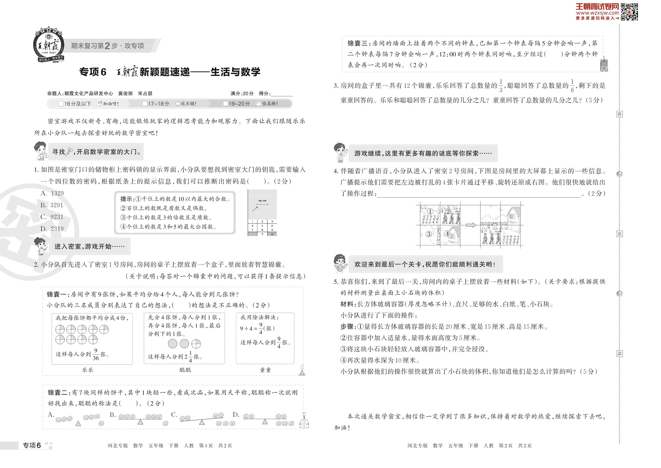 王朝霞期末专项卷——王朝霞新颖题速递:生活与数学五年级下册数学(人教版)【6】