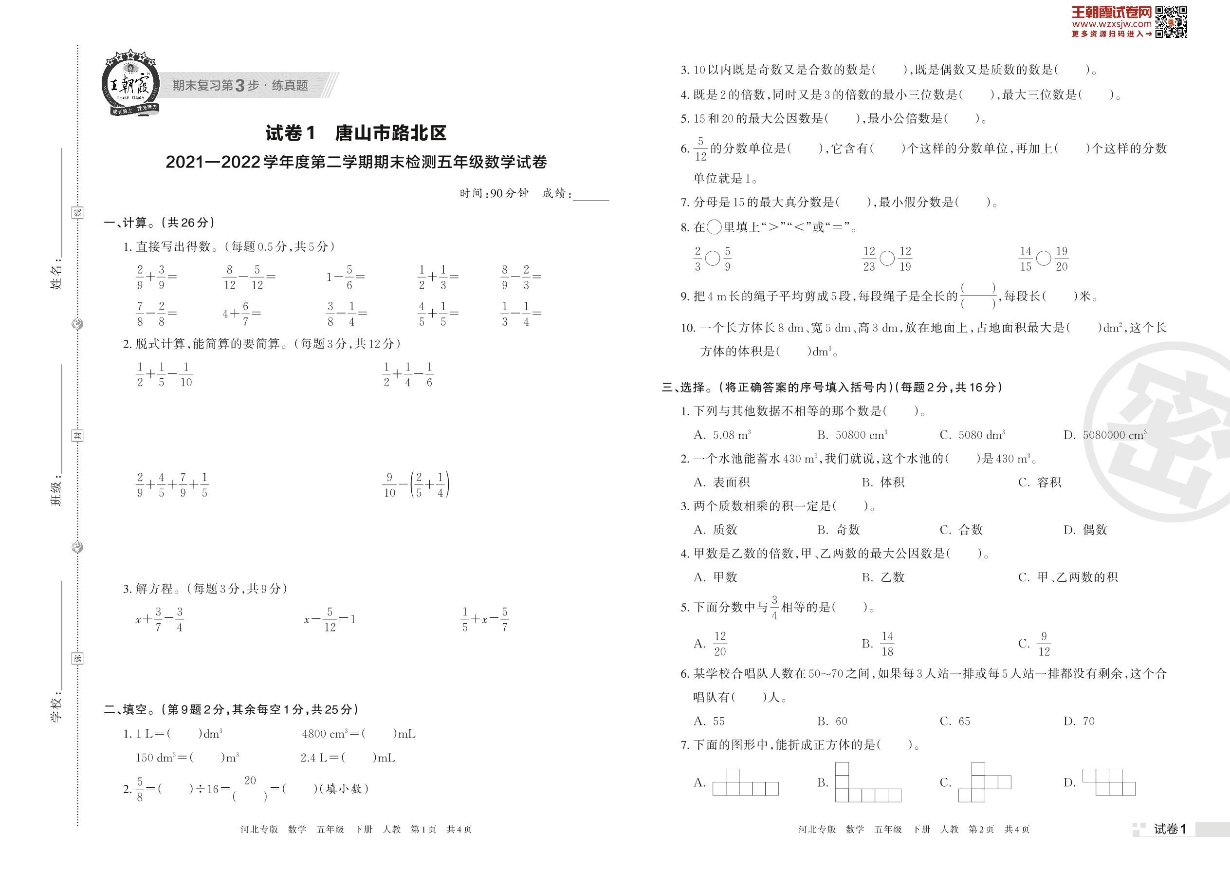 唐山市路北区2021—2022学年度第二学期期末检测五年级数学试卷(人教版)【1】
