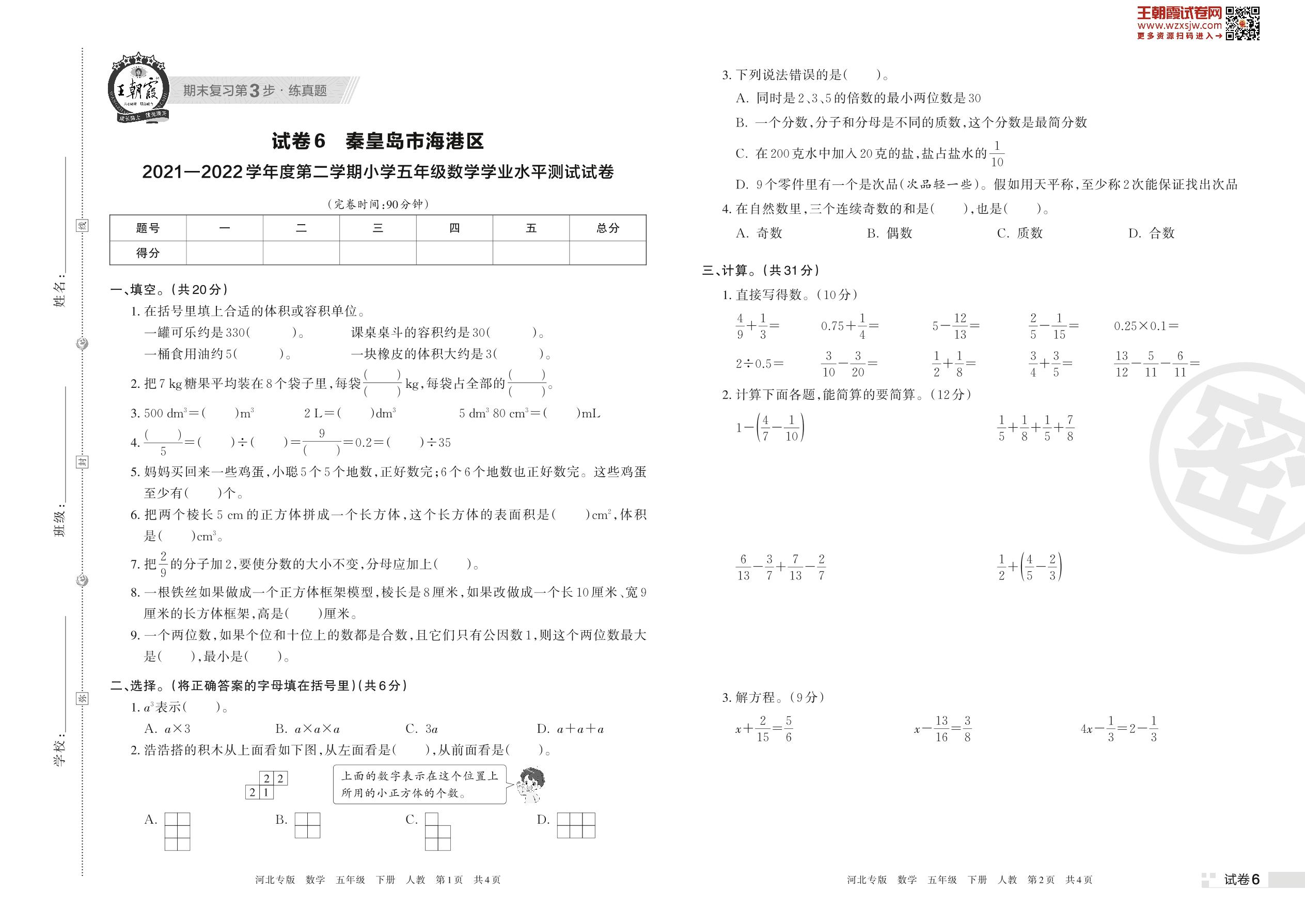 秦皇岛市海港区2021—2022学年度第二学期小学五年级数学学业水平测试试卷(人教版)【6】