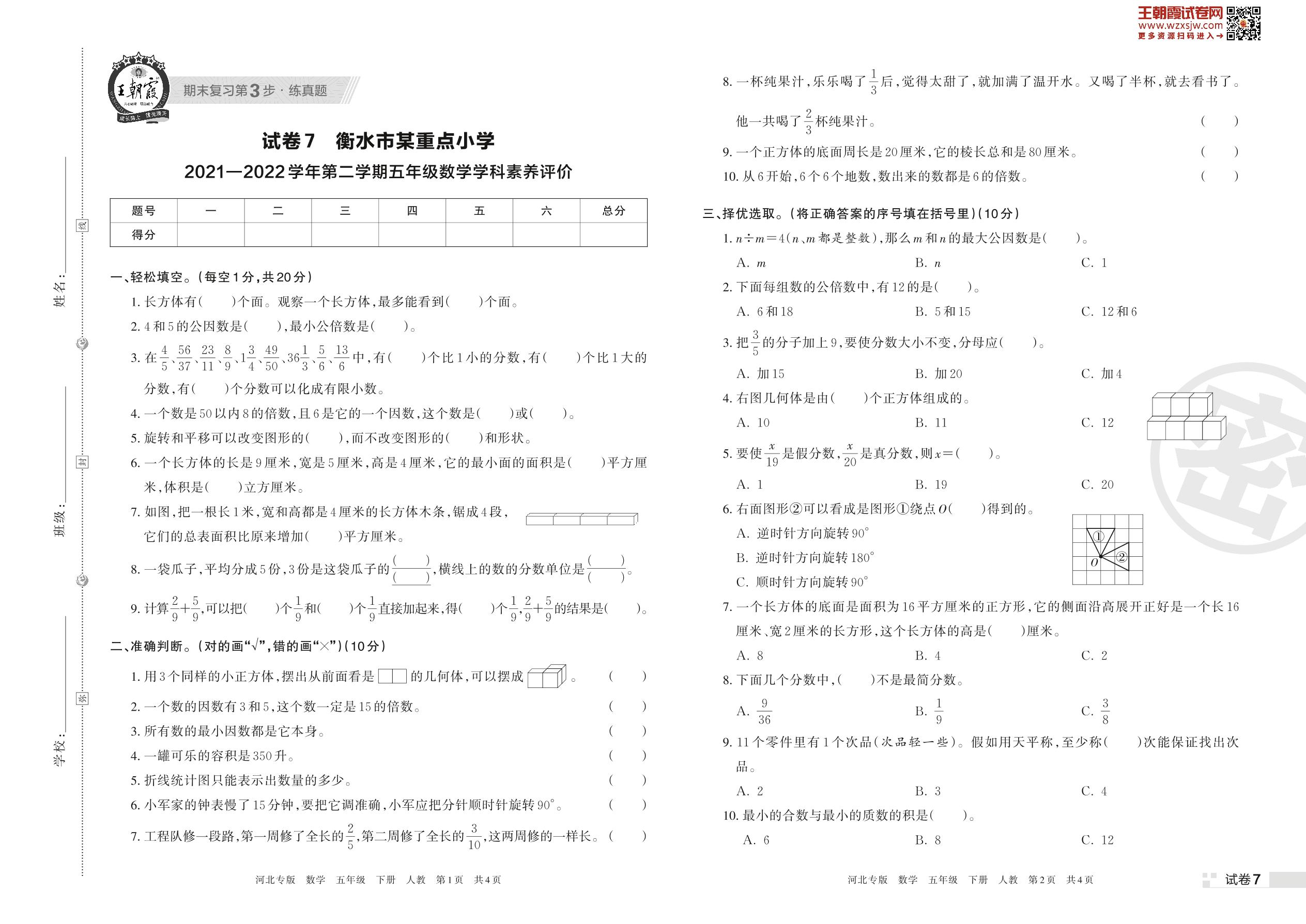 衡水市某重点小学2021—2022学年第二学期五年级数学学科素养评价(人教版)【7】
