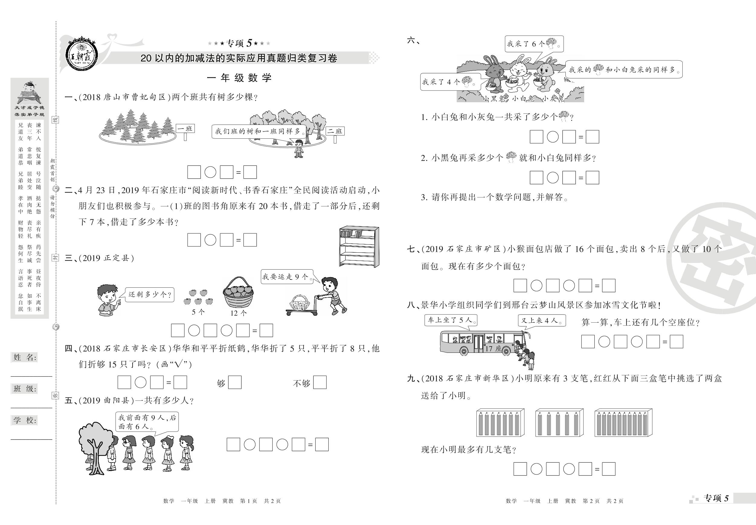 王朝霞期末专项卷——20以内的加减法的实际应用、图形与规律真题归类复习一年级上册数学(冀教版)_R210802214656【0】