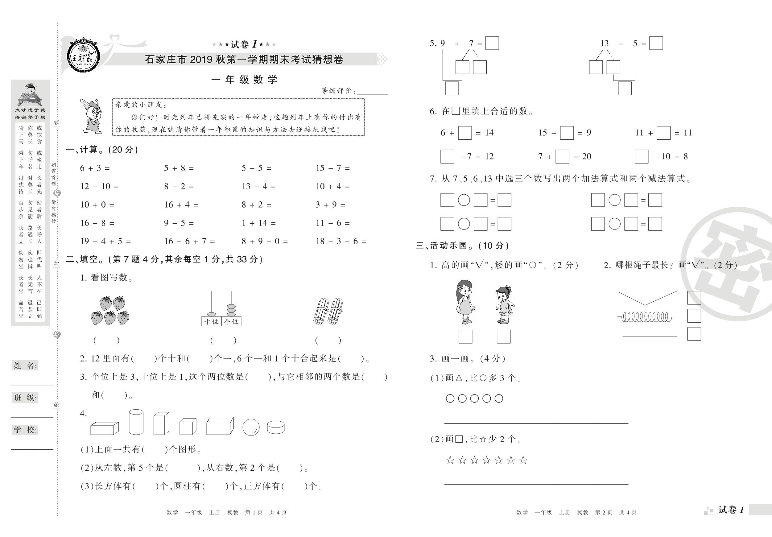 2019-2020学年第一学期石家庄市猜想卷一年级数学试卷(冀教版)【1】
