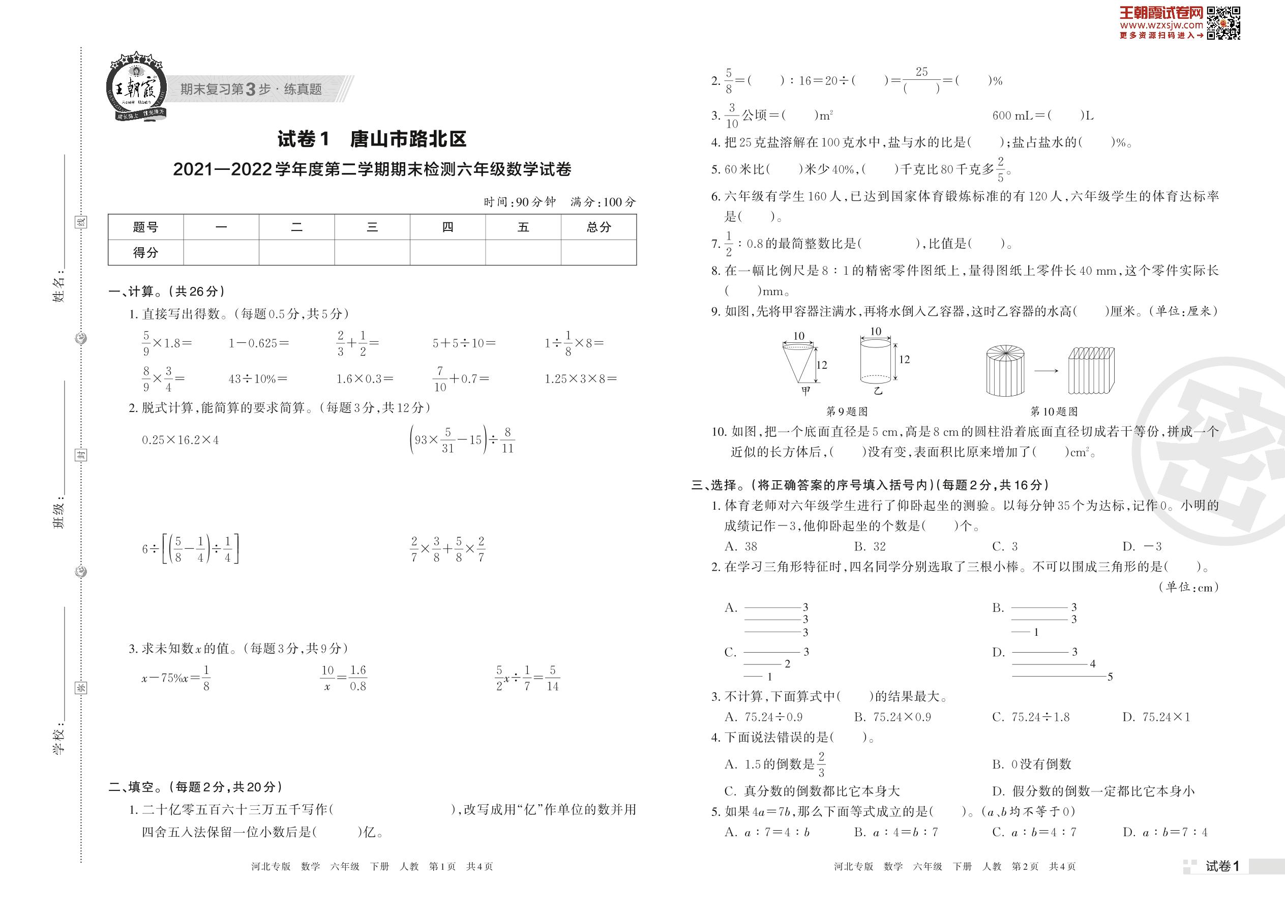 唐山市路北区2021—2022学年度第二学期期末检测六年级数学试卷(人教版)【1】