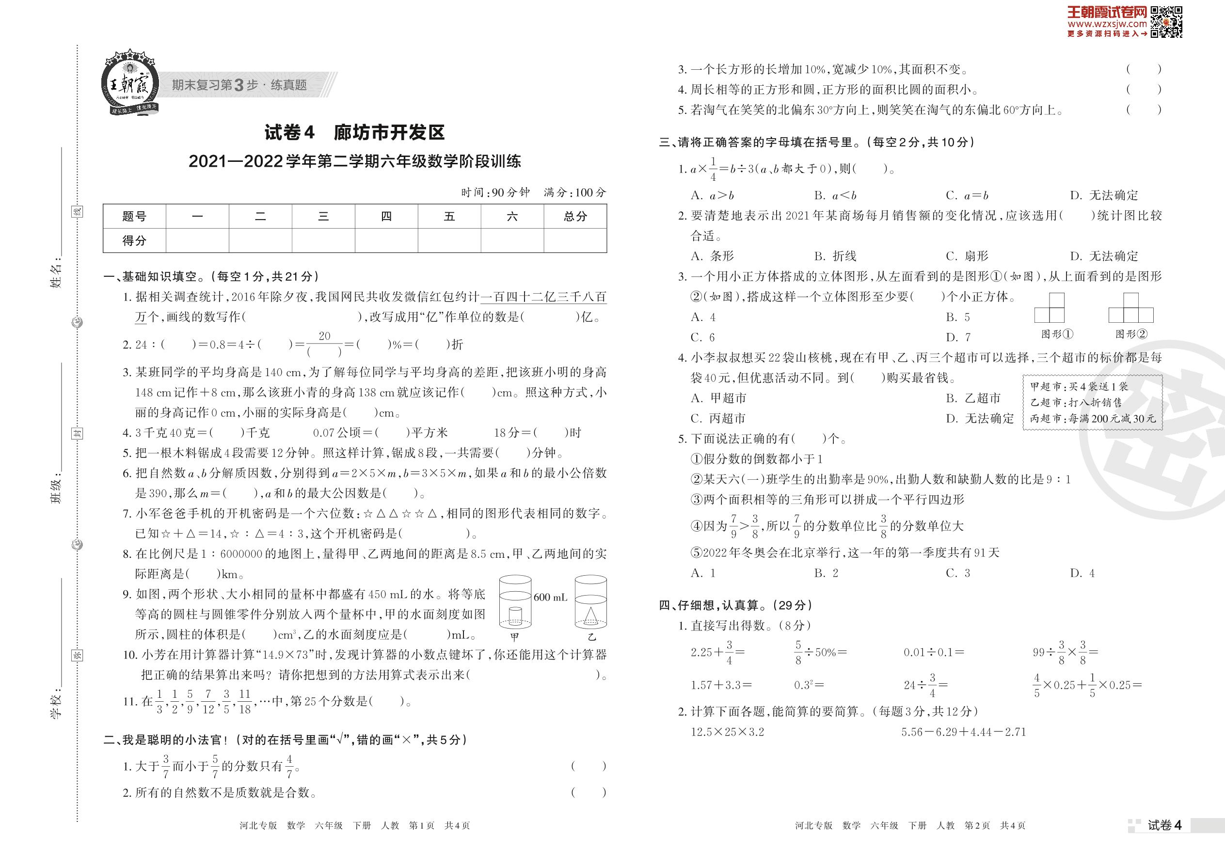 廊坊市开发区2021—2022学年第二学期六年级数学阶段训练(人教版)【4】