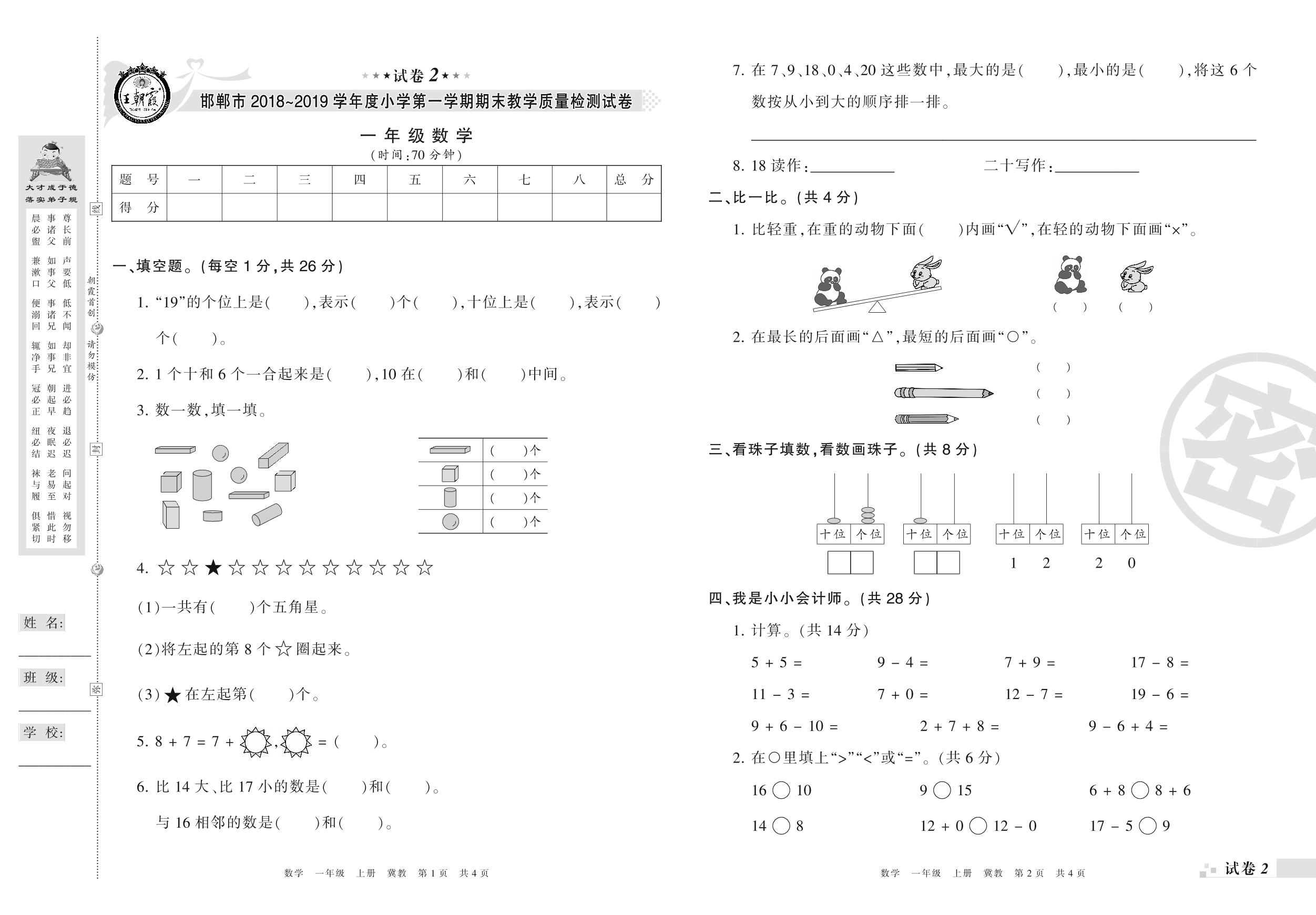 2018-2019学年第一学期邯郸市一年级数学试卷(冀教版)【2】